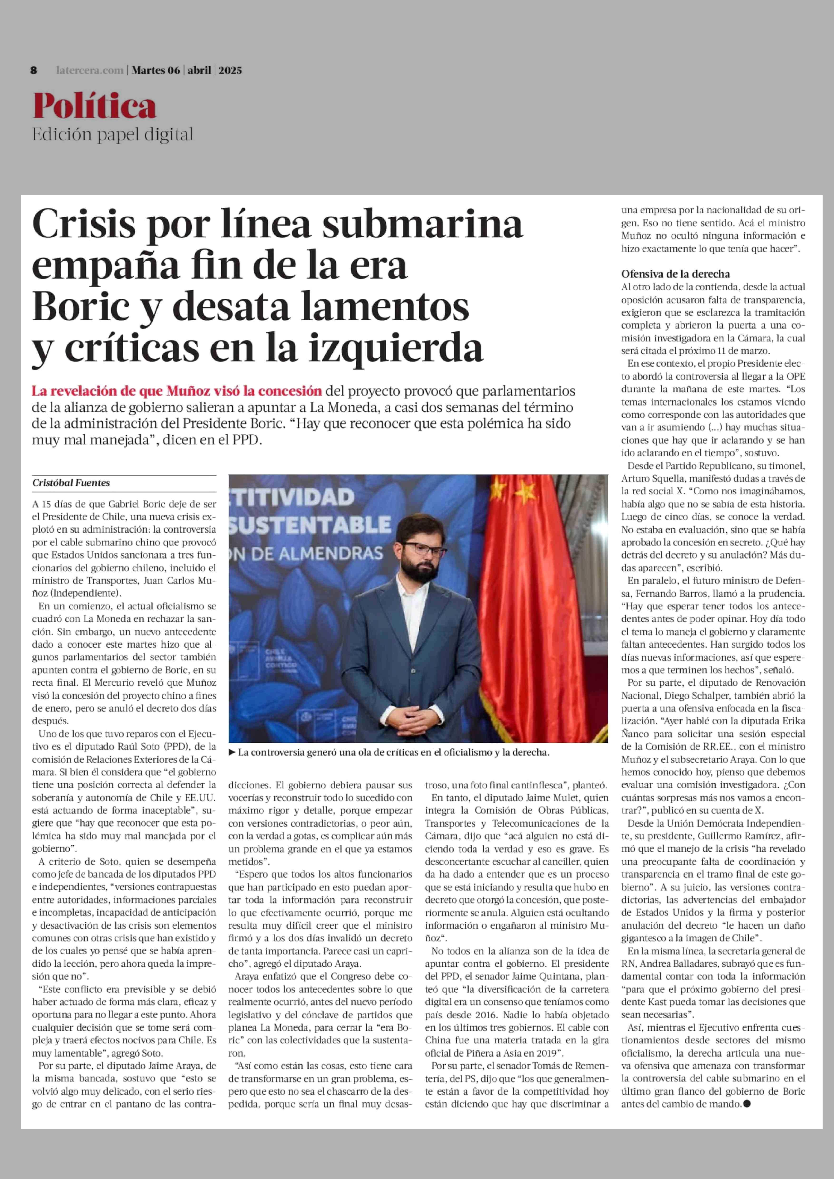 Título: Crisis por línea submarina empaña fin de la era Boric y desata lamentos y críticas en la izquierda