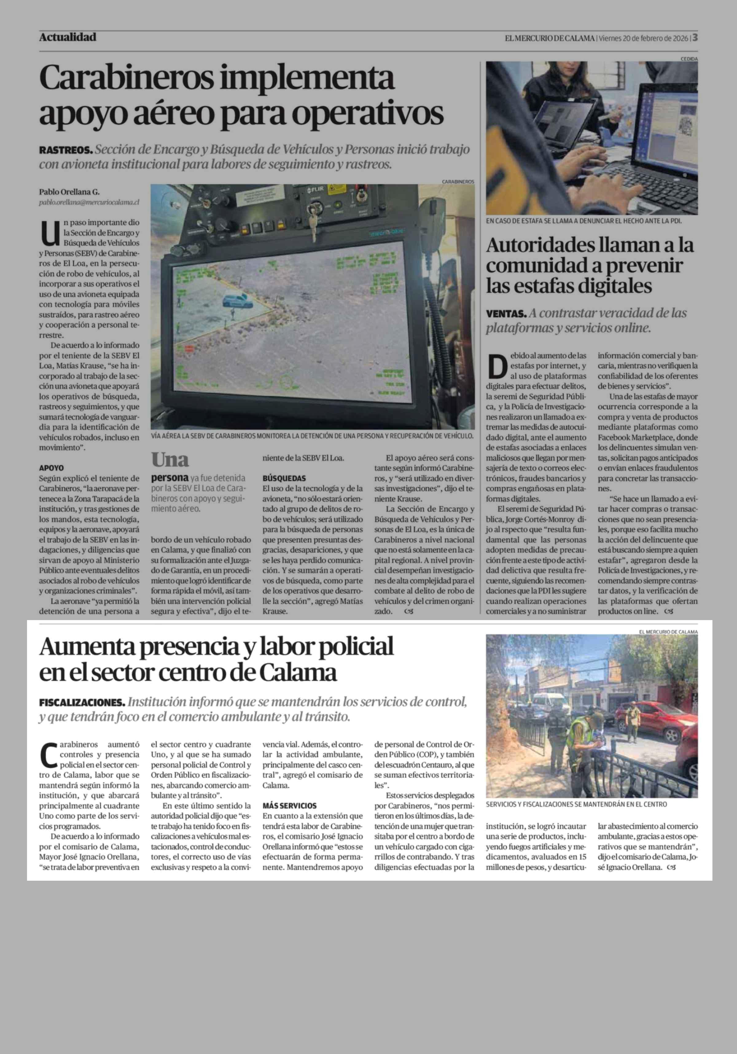 Aumenta presencia y labor policial en el sector centro de Calama 20-02-2026 El Mercurio de Calama |