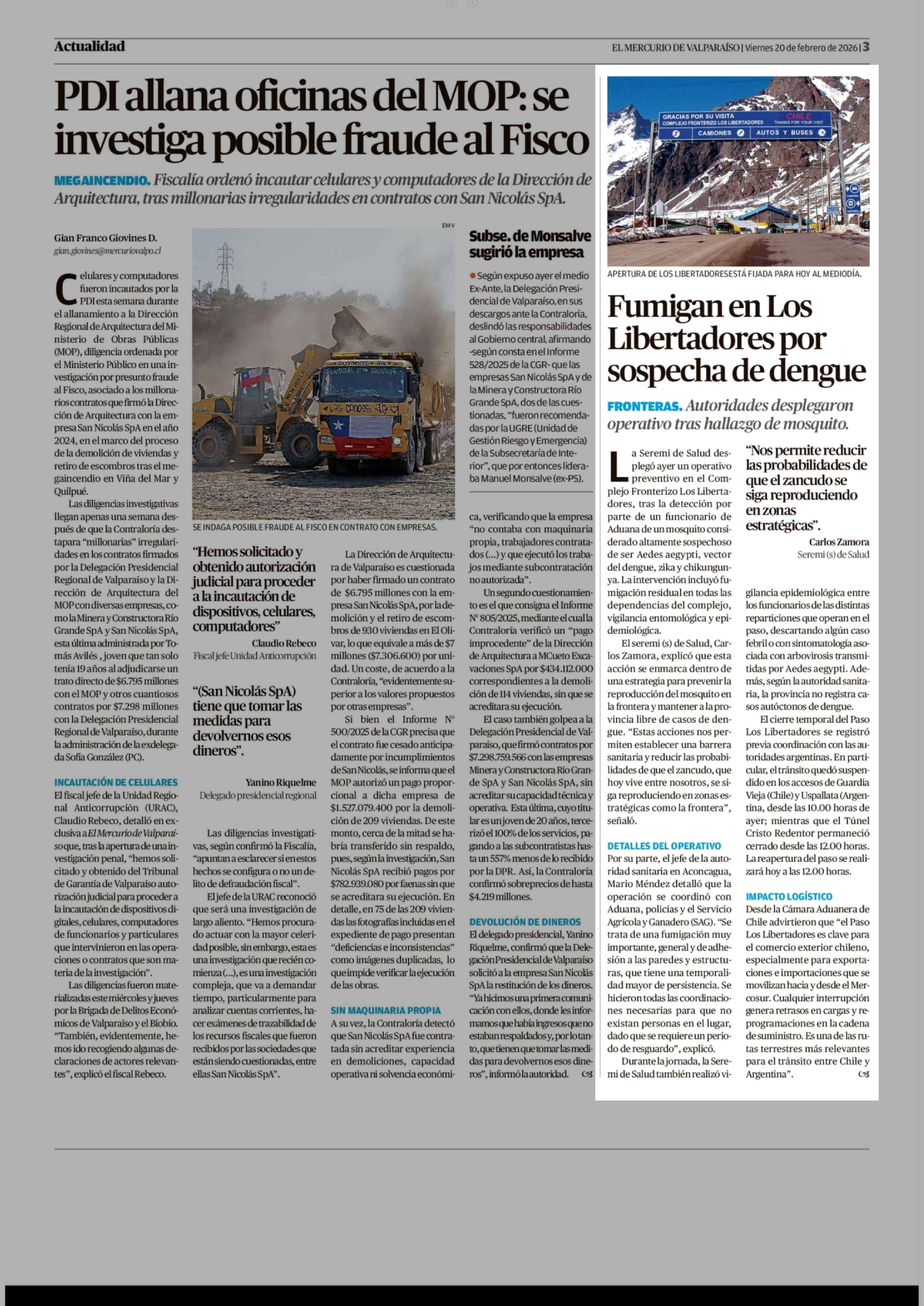Fumigan en Los Libertadores por sospecha de dengue 20-02-2026 El Mercurio de Valparaíso |