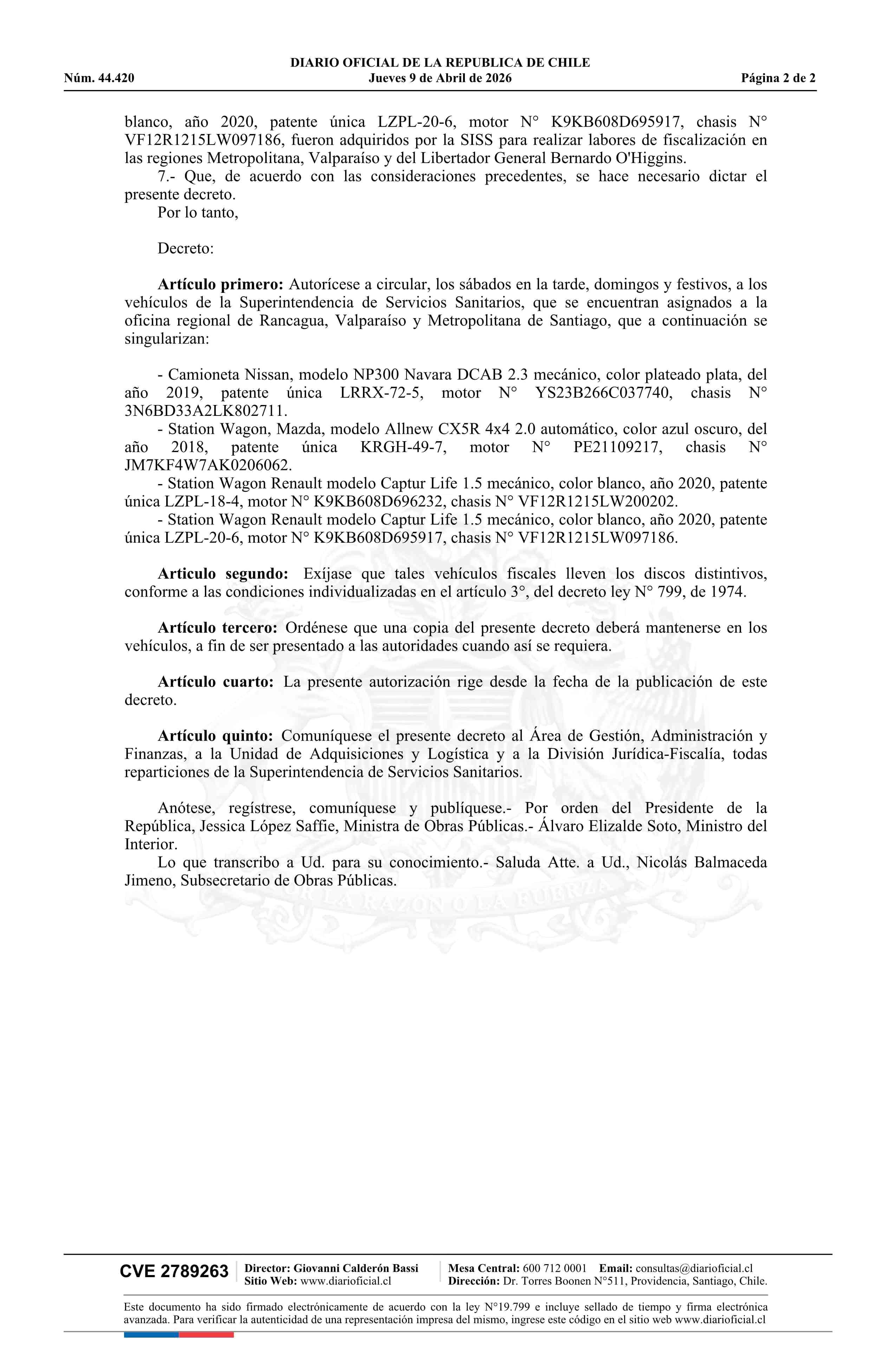 | Título: | Decreto número 332, de 2025.- Autoriza circulación de vehículos de la Superintendencia de Servicios Sanitarios, en días sábado en la tarde, domingo y festivos, y uso del disco fiscal en los vehículos que indica |