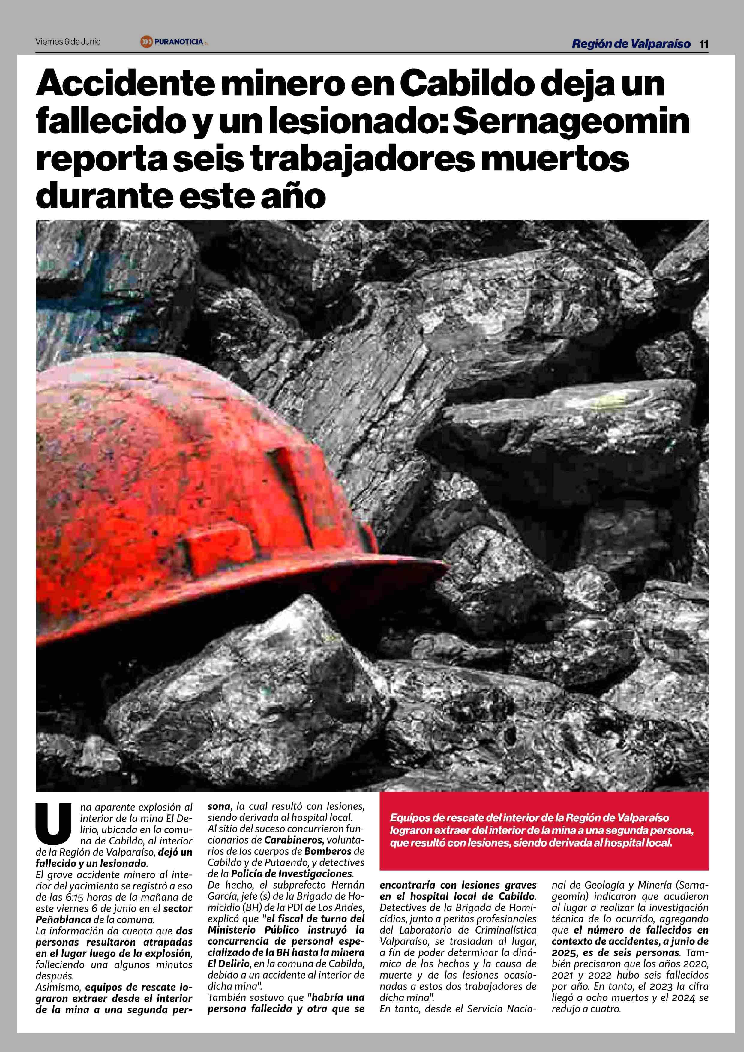 Accidente minero en Cabildo deja un fallecido y un lesionado: Sernageomin reporta seis trabajadores muertos durante este año 06-06-2025 Puranoticia.cl |