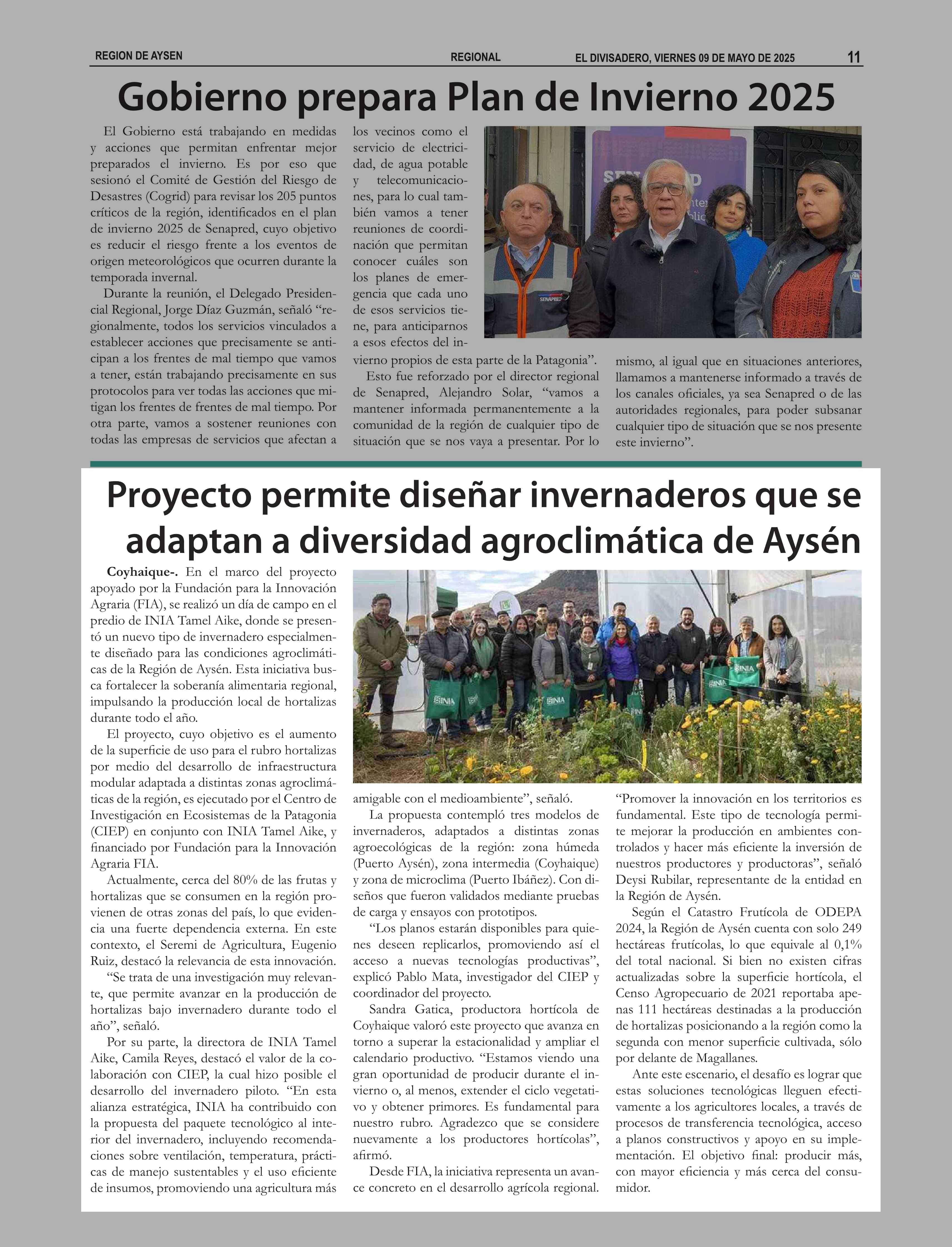 Proyecto permite diseñar invernaderos que se adaptan a diversidad agroclimática de Aysén 09-05-2025 El Divisadero |
