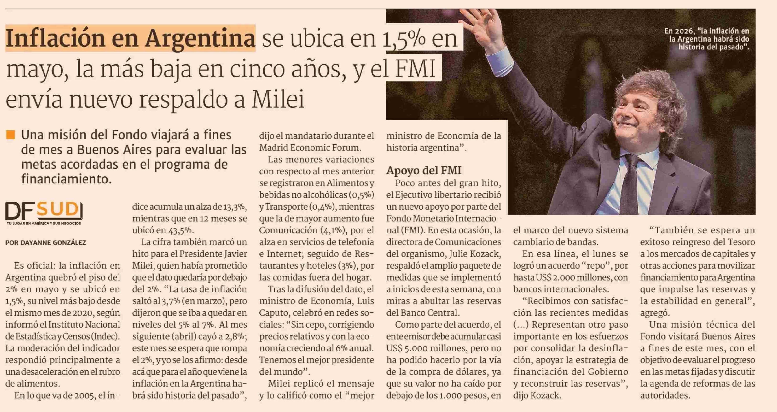 Título: Inflación en Argentina se ubica en 1,5% en mayo, la más baja en cinco años, y el FMI envía nuevo respaldo a Milei