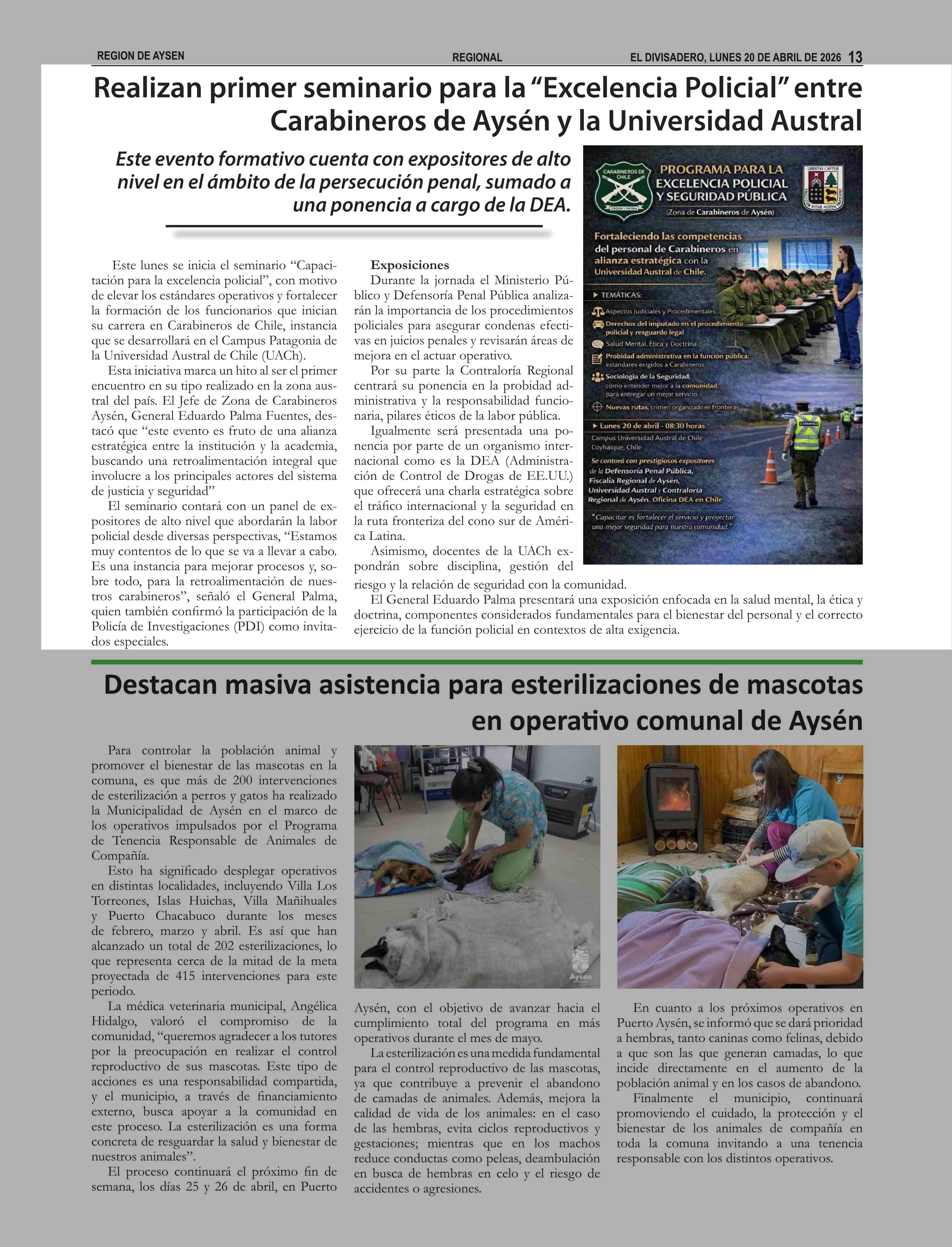 Realizan primer seminario para la “Excelencia Policial” entre Carabineros de Aysén y la Universidad Austral 20-04-2026 El Divisadero |