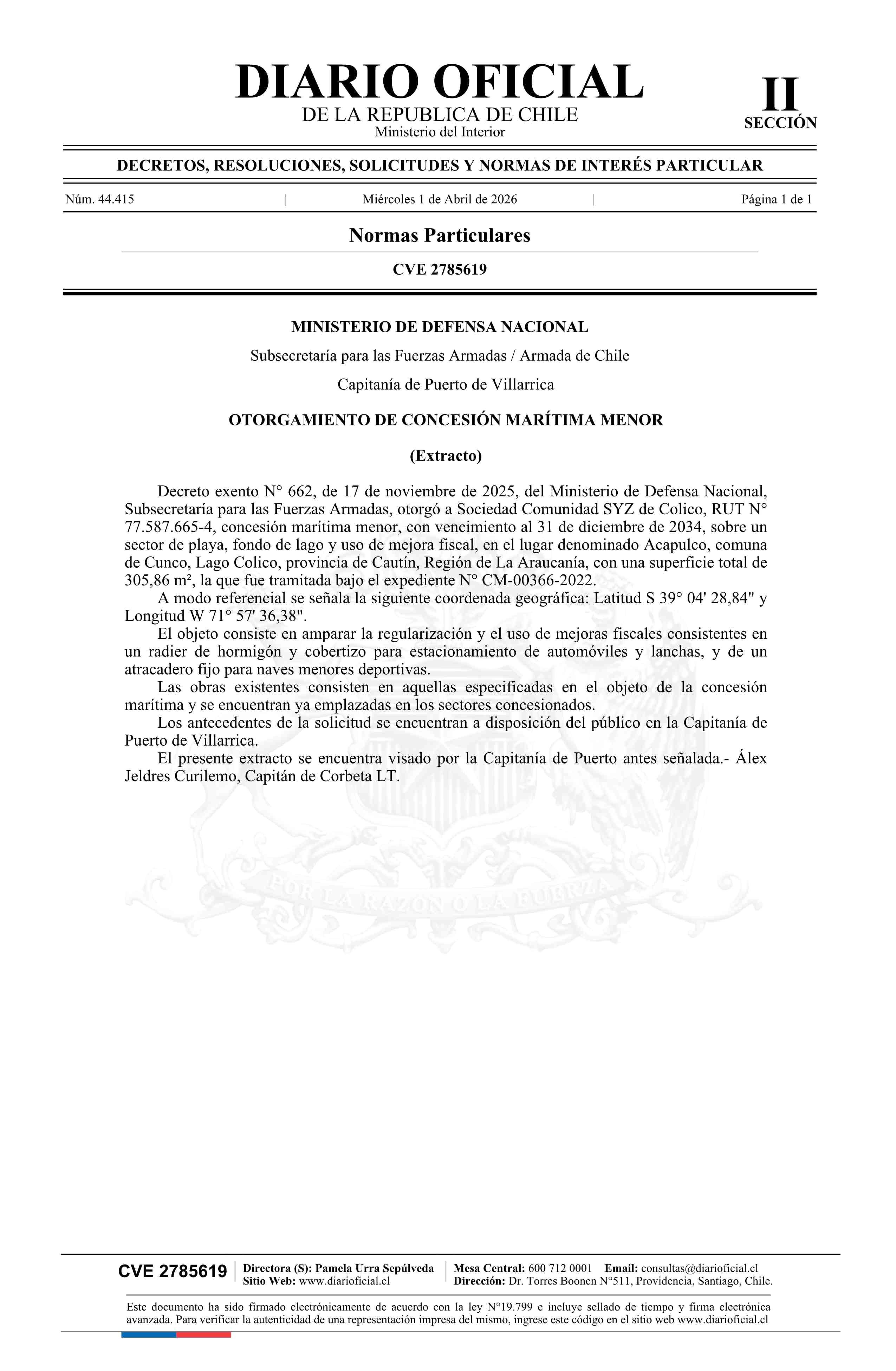 | Título: | Extracto de decreto exento número 662, de 2025.- Otorgamiento de concesión marítima menor |