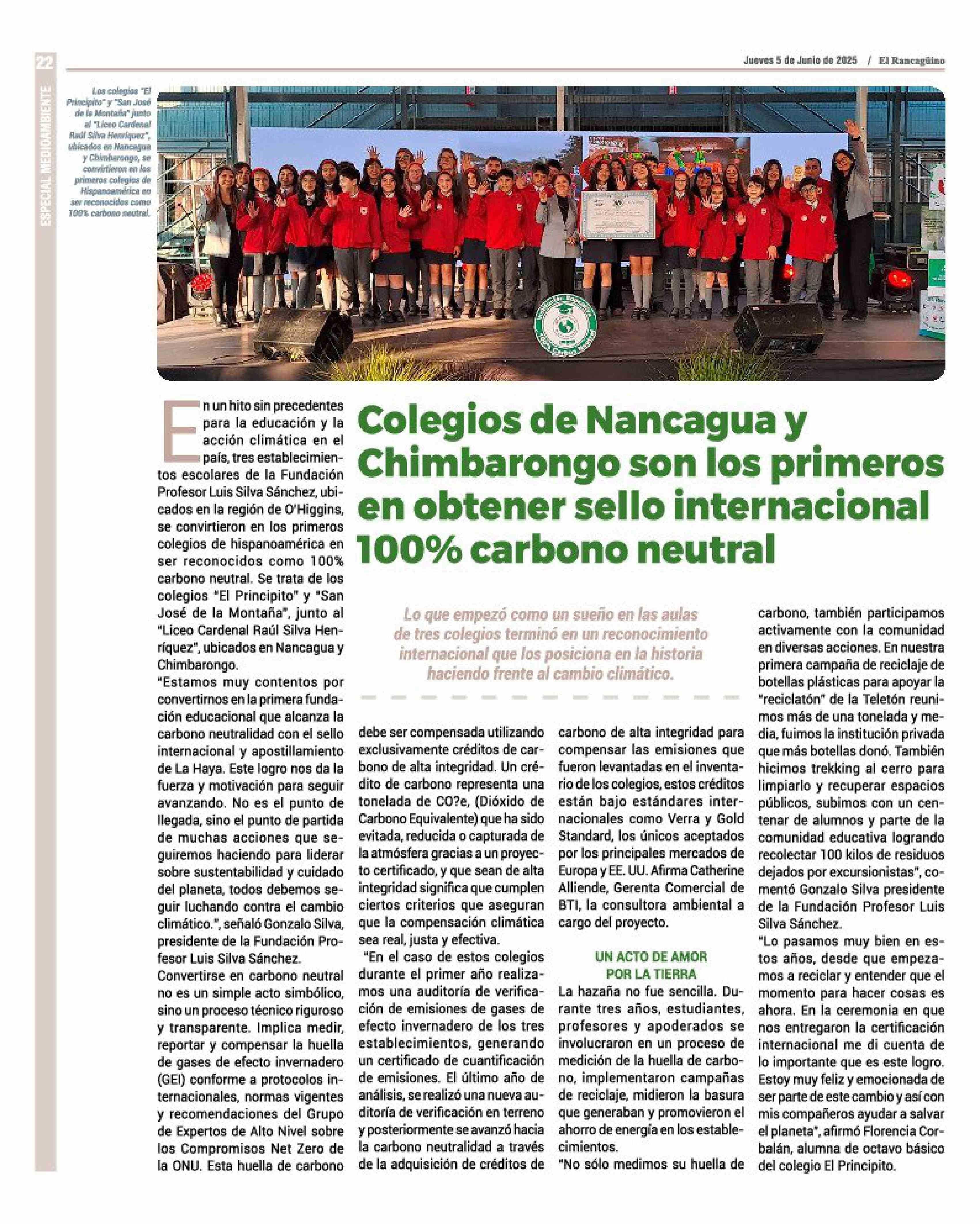 Colegios de Nancagua y Chimbarongo son los primeros en obtener sello internacional 100% carbono neutral 05-06-2025 El Rancagüino |