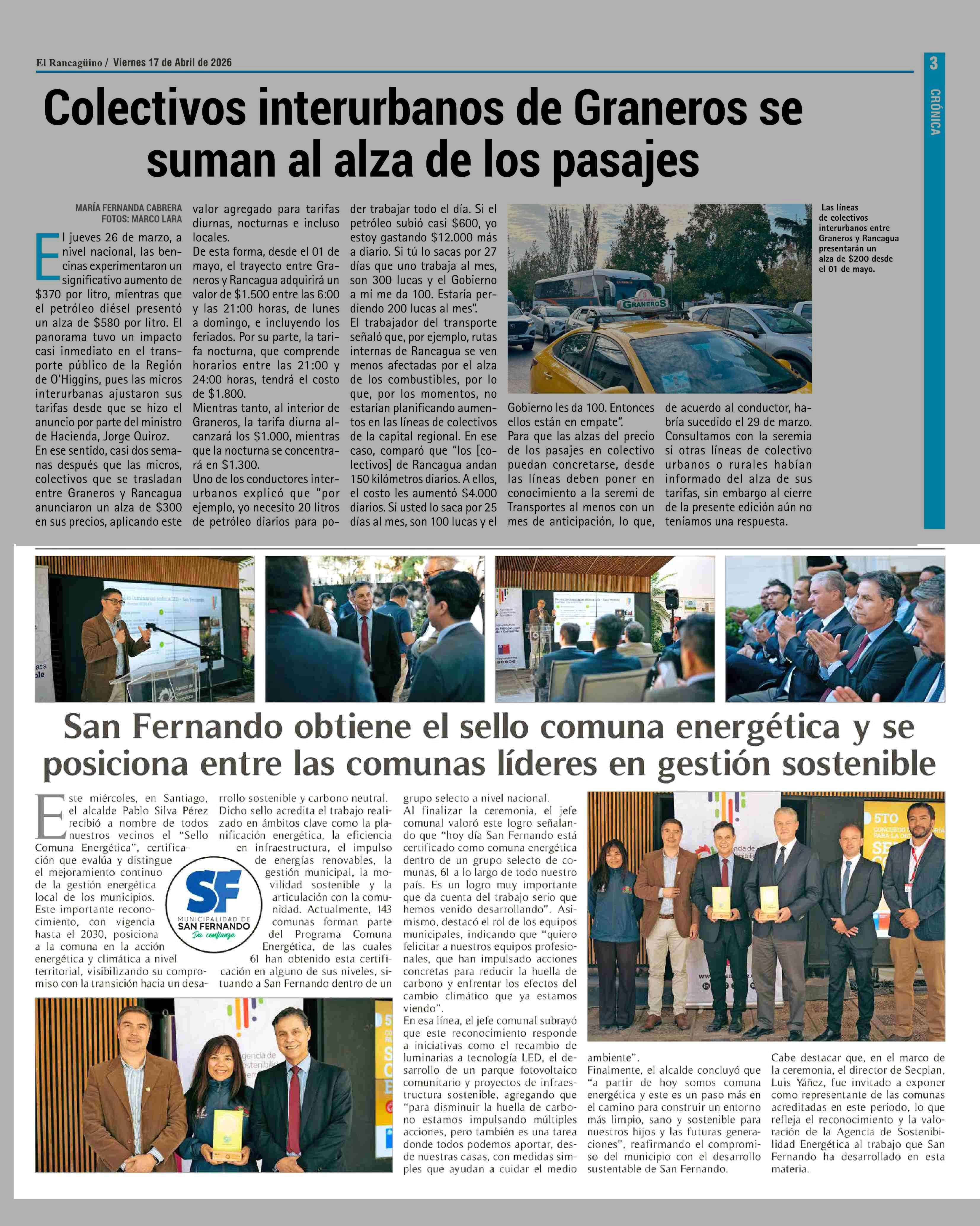 San Fernando obtiene el sello comuna energética y se posiciona entre las comunas líderes en gestión sostenible 17-04-2026 El Rancagüino |