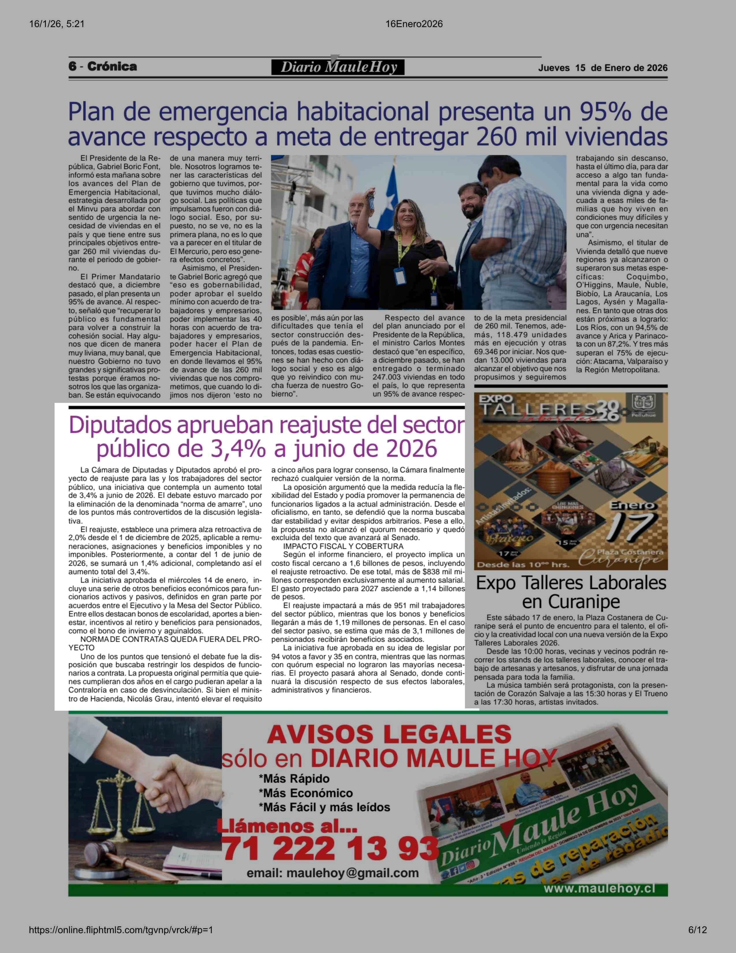 Diputados aprueban reajuste del sector público de 3,4% a junio de 2026 16-01-2026 Maule Hoy |