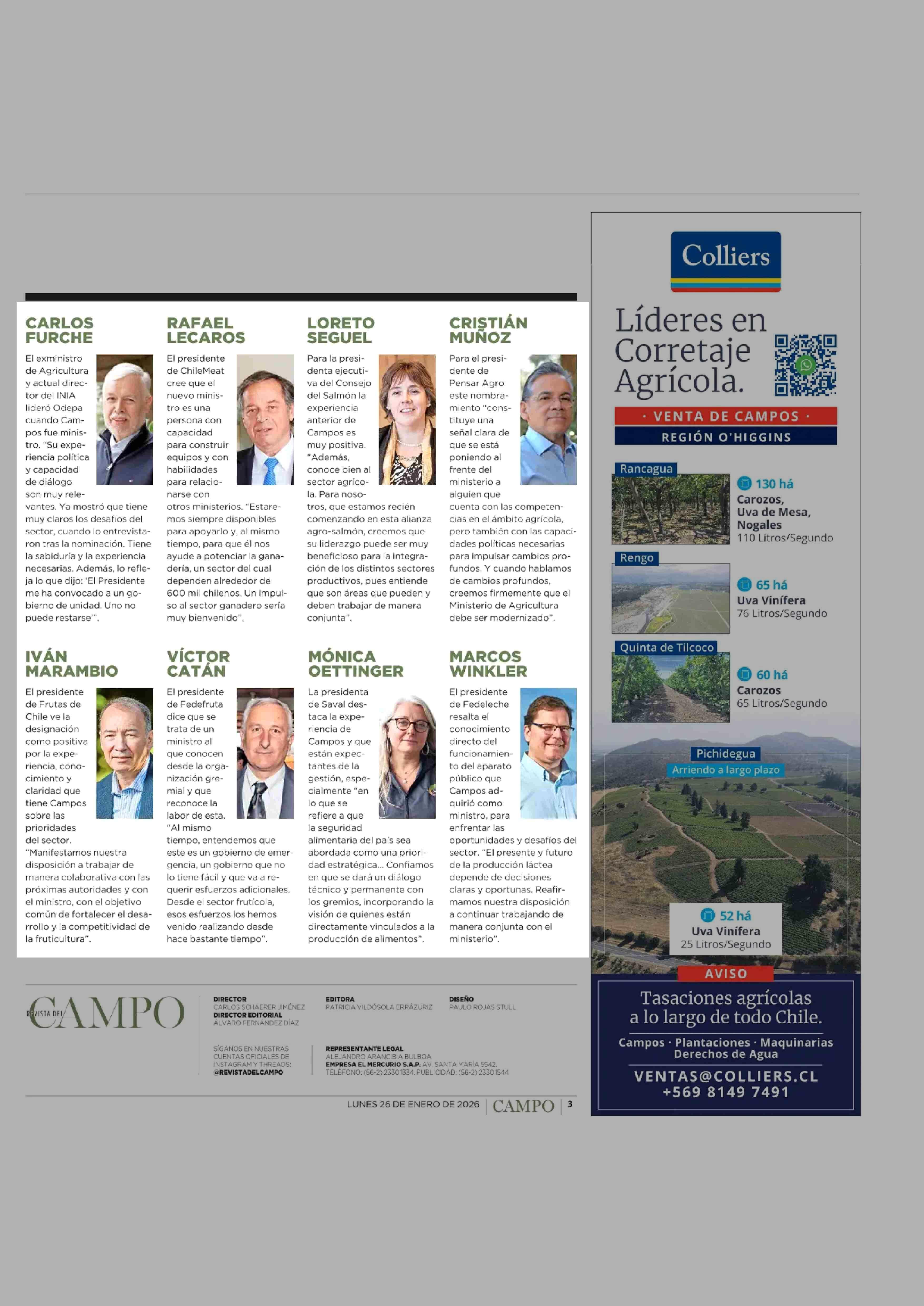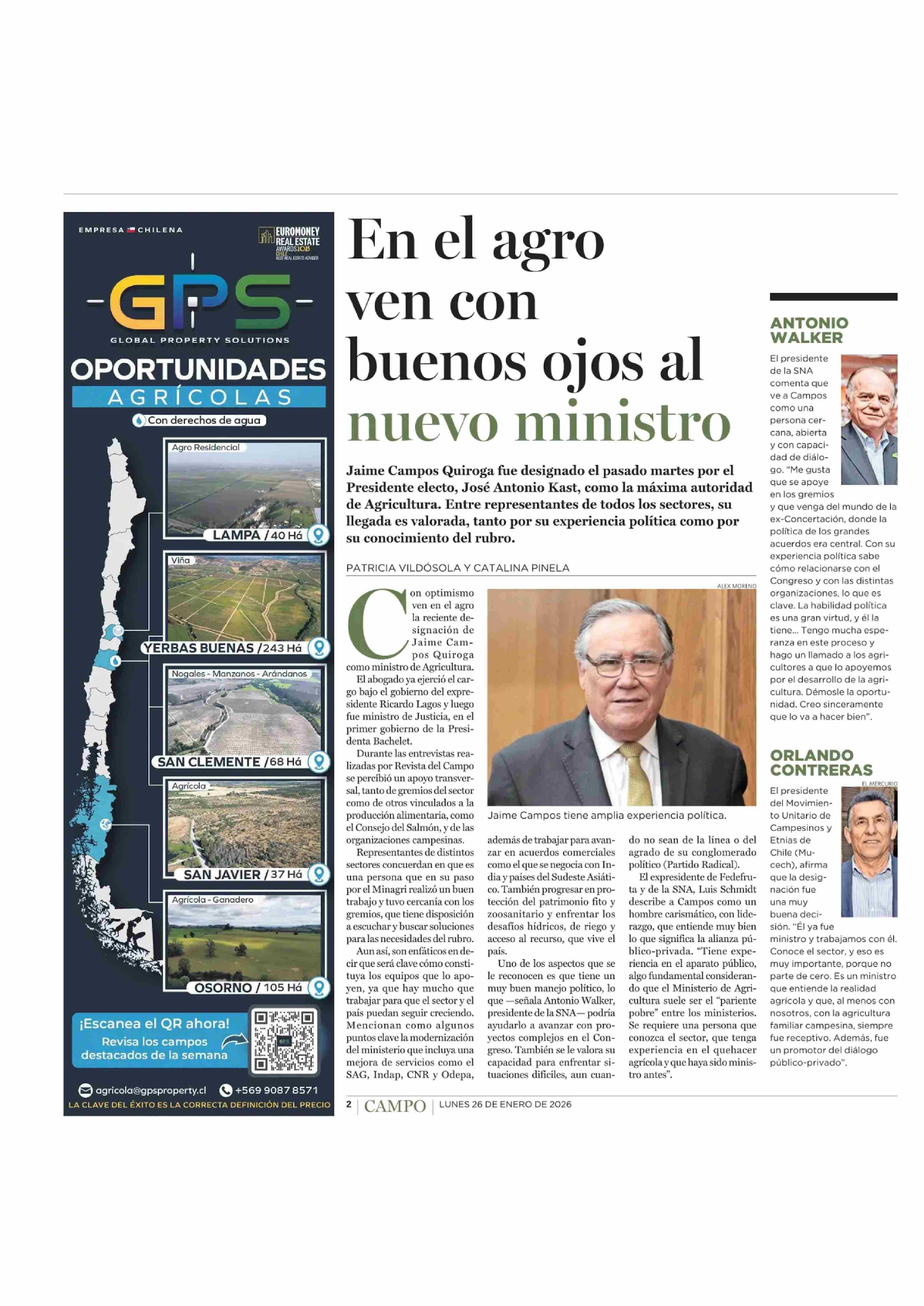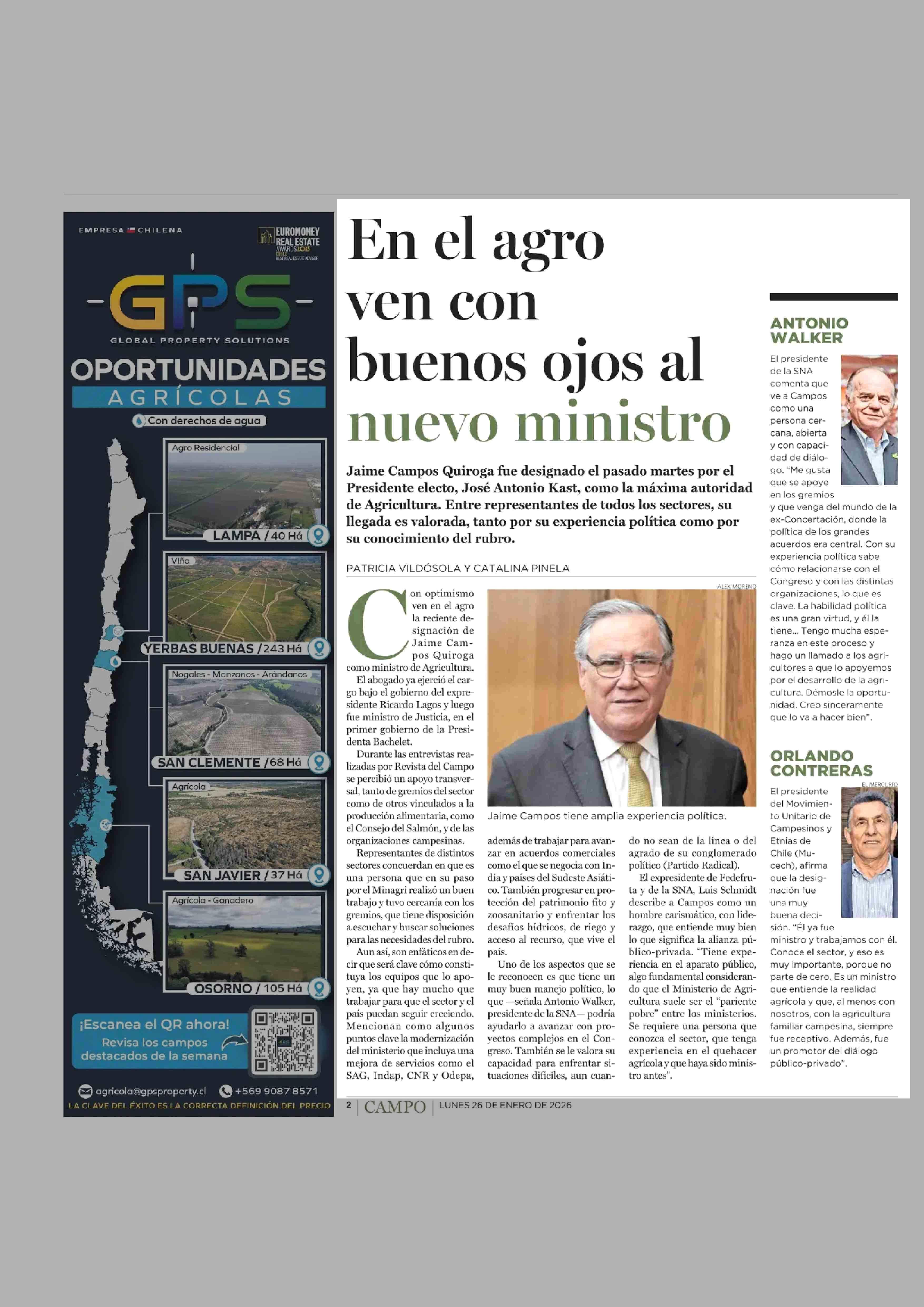 En el agro ven con buenos ojos al nuevo ministro 26-01-2026 El Mercurio |