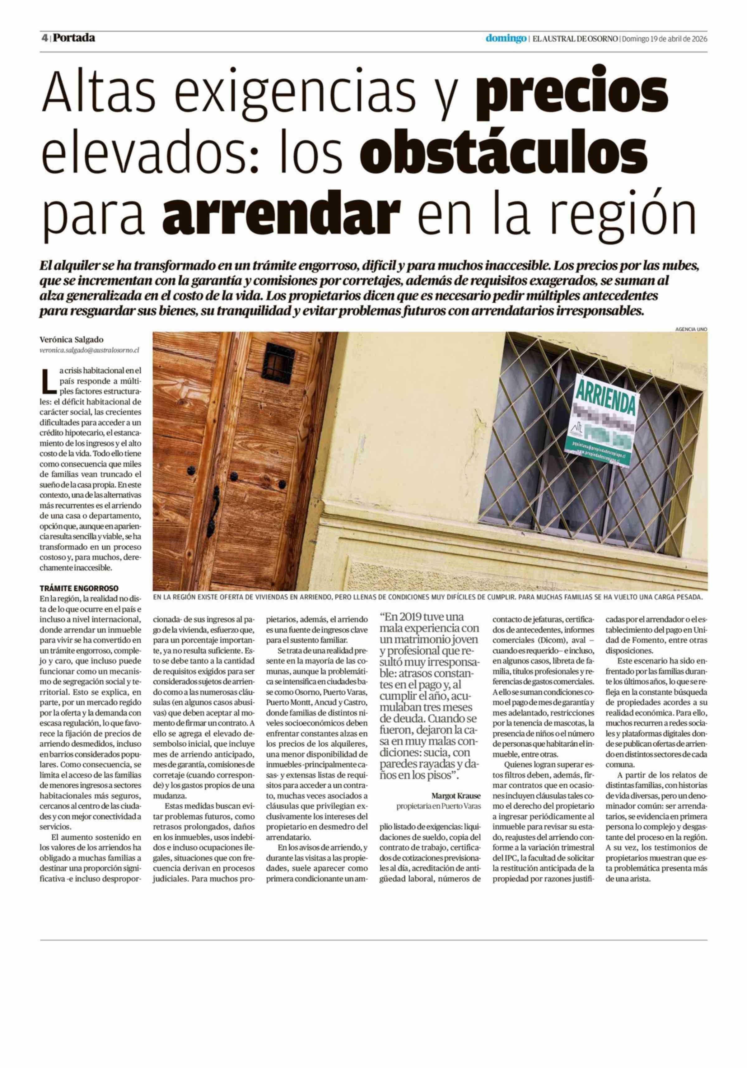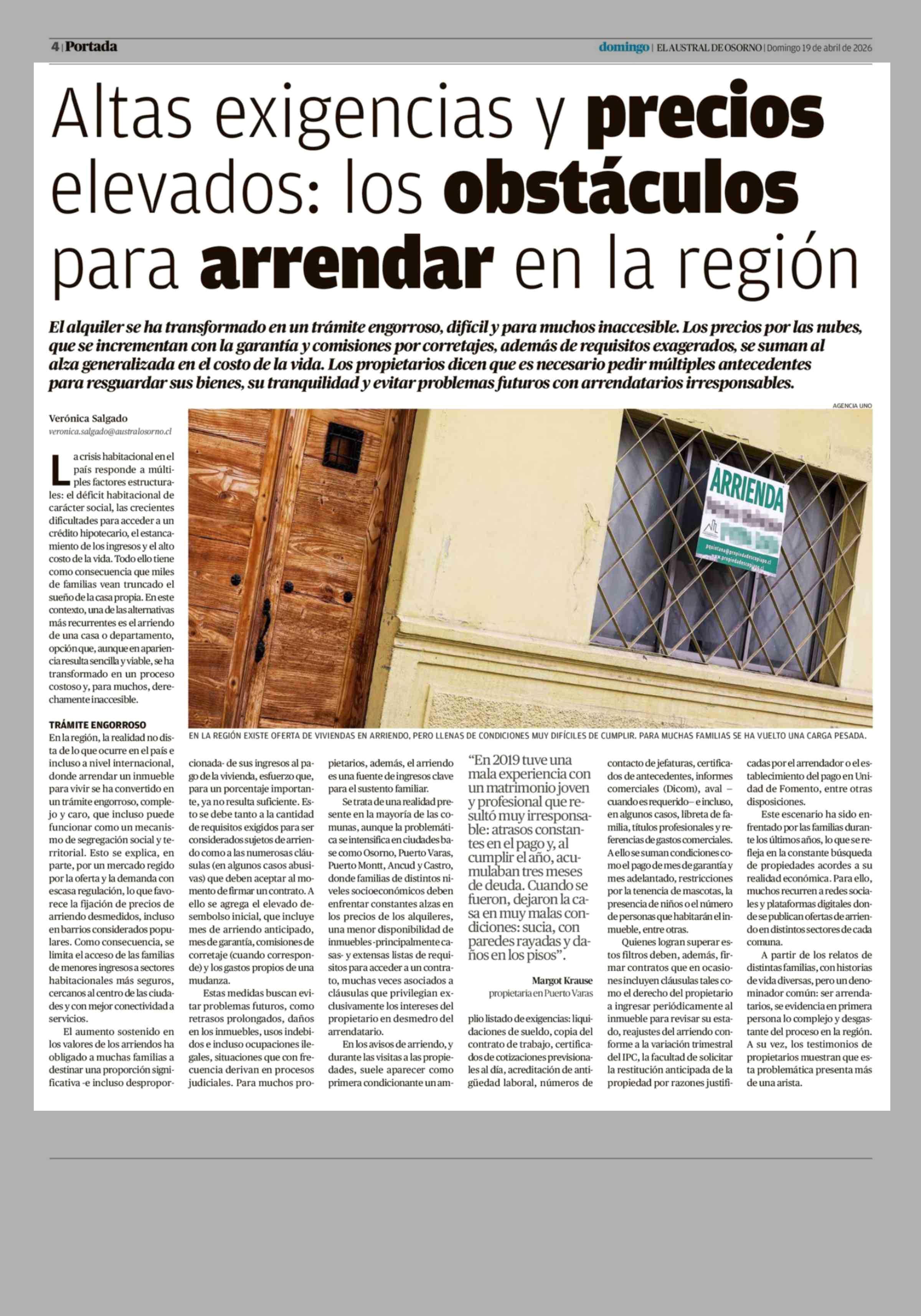 Altas exigencias y precios elevados: los obstáculos para arrendar en la región 19-04-2026 El Austral de Osorno |