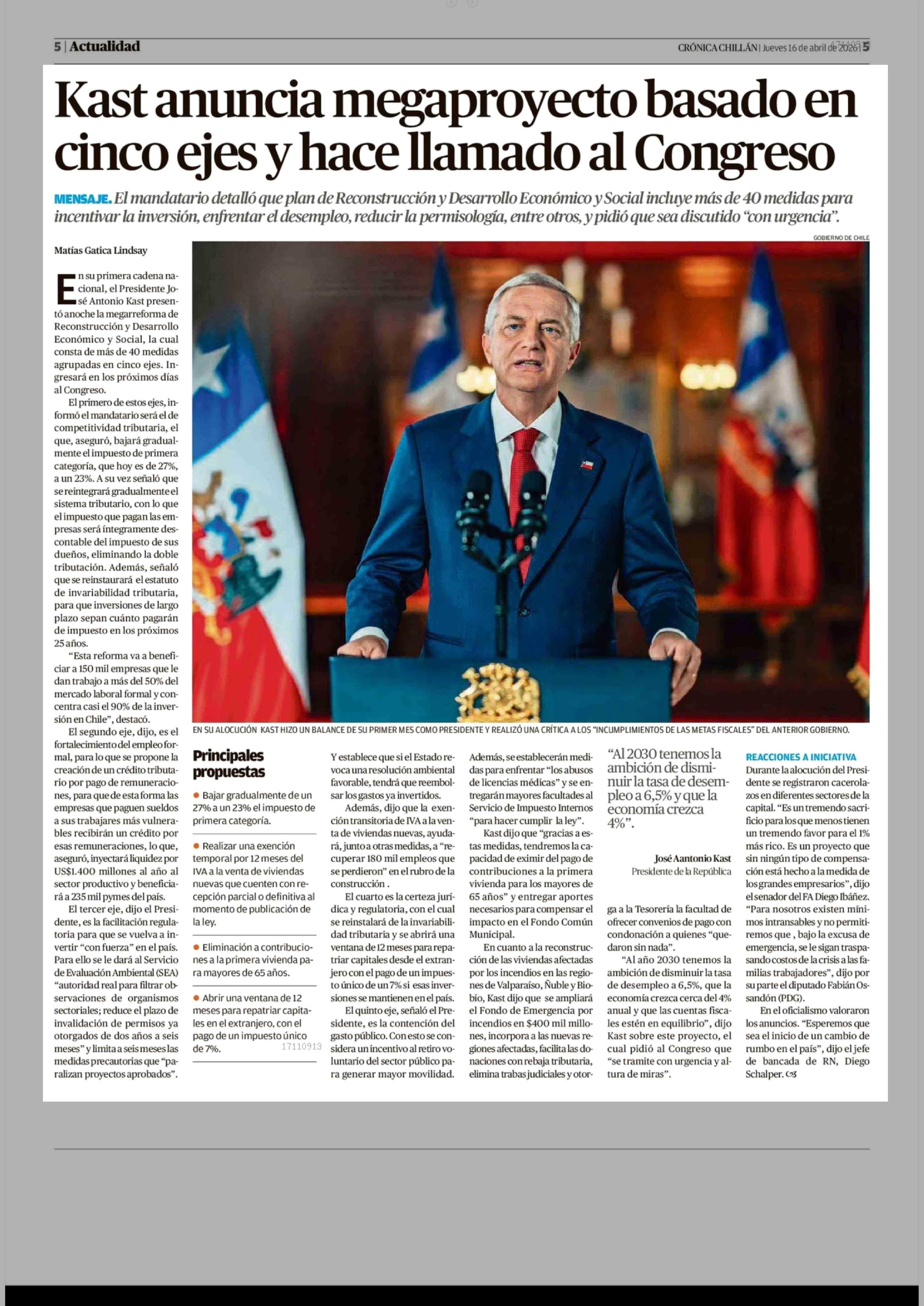 Título: Kast anuncia megaproyecto basado en cinco ejes y hace llamado al Congreso
