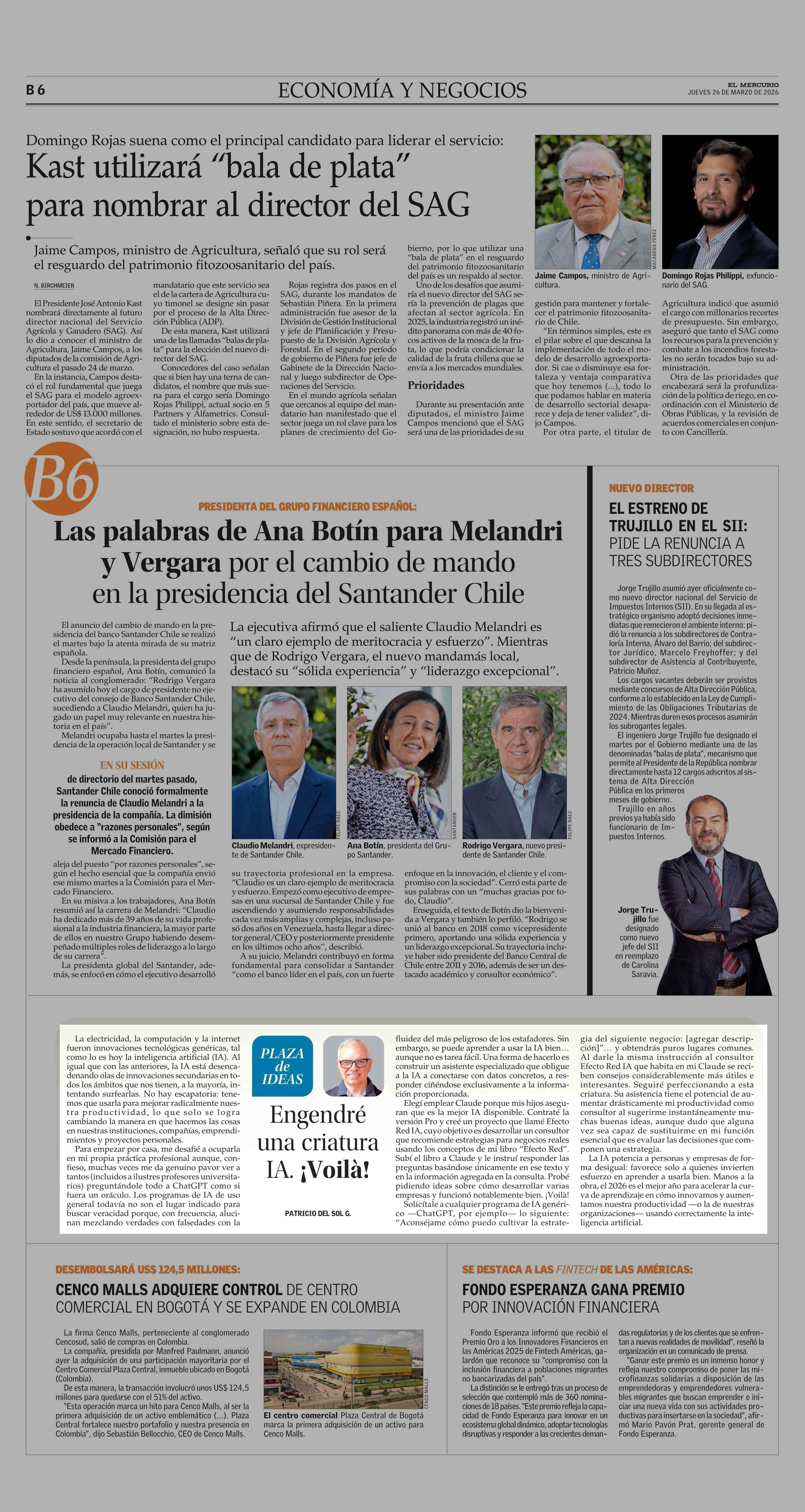 Columnas de Opinión: Engendré una criatura IA. ¡Voilà! 26-03-2026 El Mercurio |