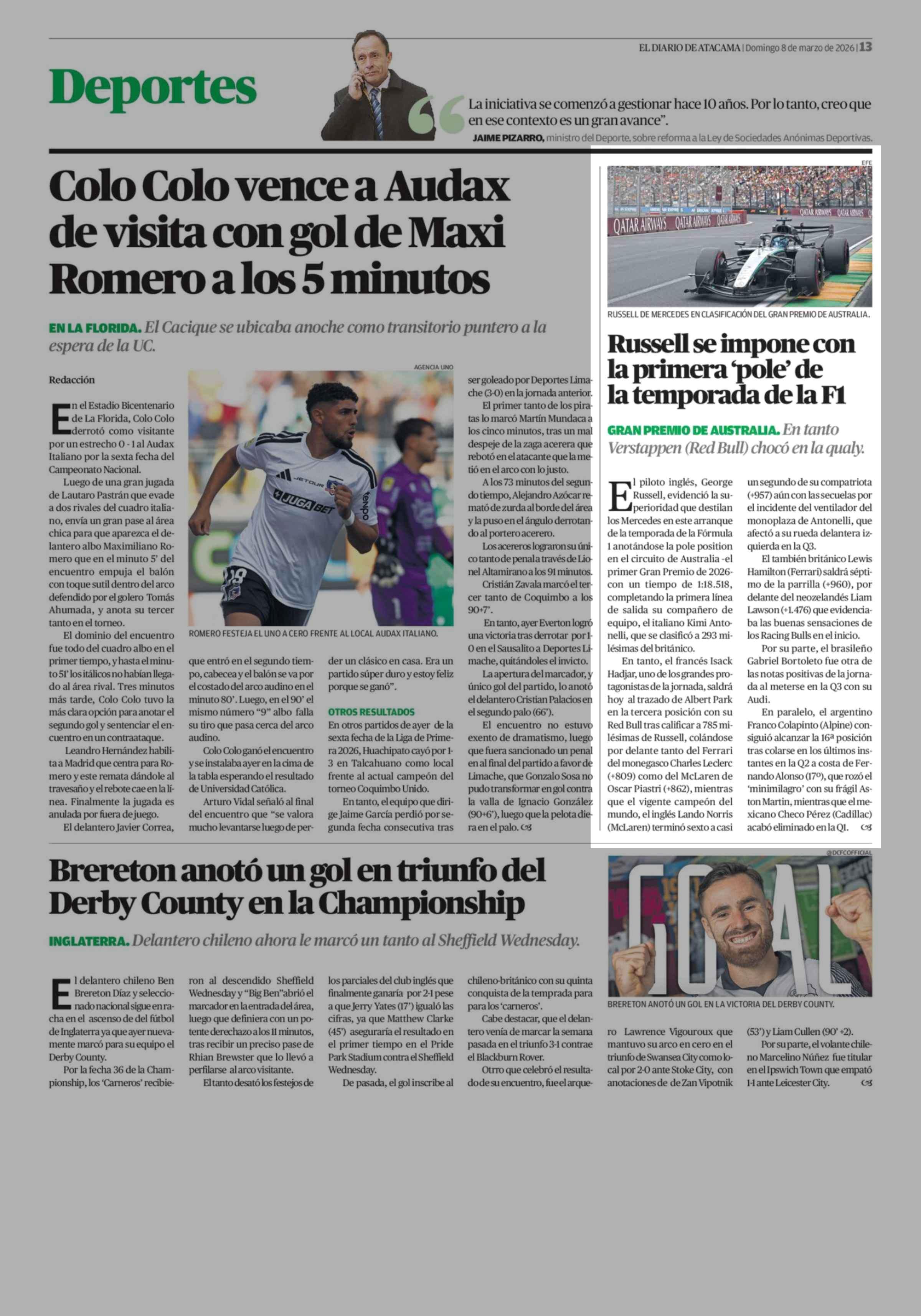 Russell se impone con la primera 'pole' de la temporada de la F1 08-03-2026 El Diario de Atacama |
