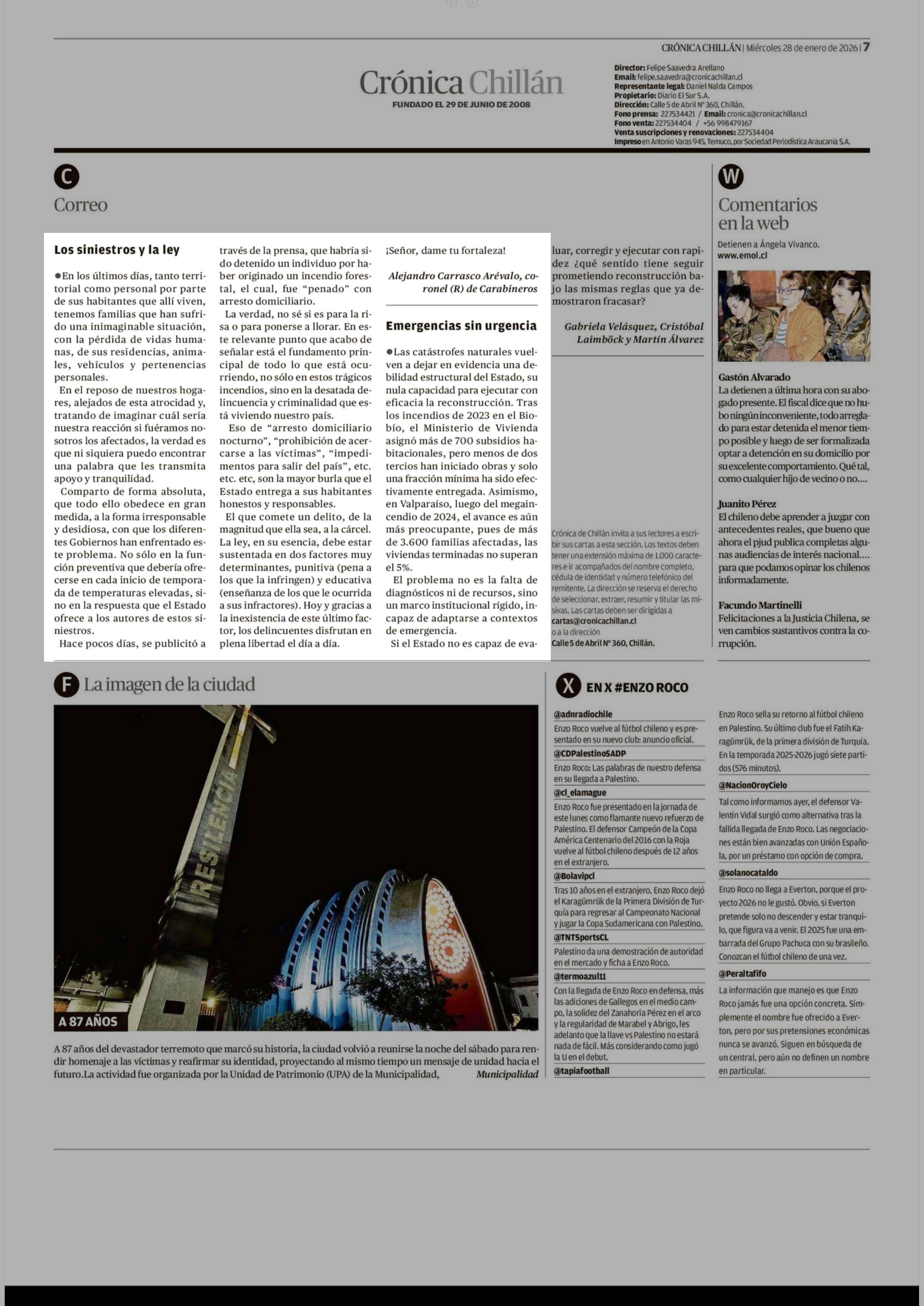 Cartas: Los siniestros y la ley 28-01-2026 Crónica de Chillán |