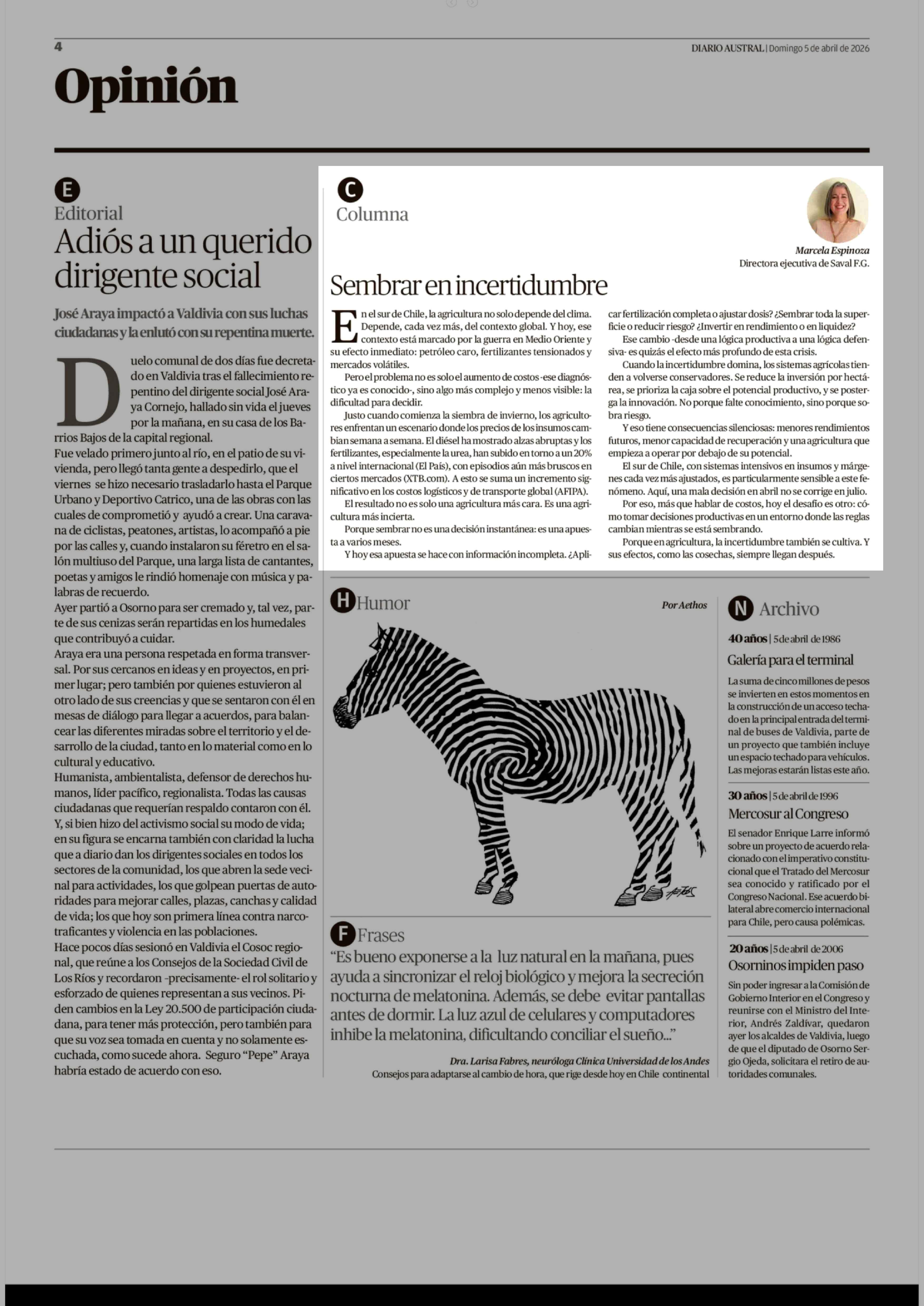 Columnas de Opinión: Sembrar en incertidumbre 05-04-2026 Diario Austral Región de Los Ríos |