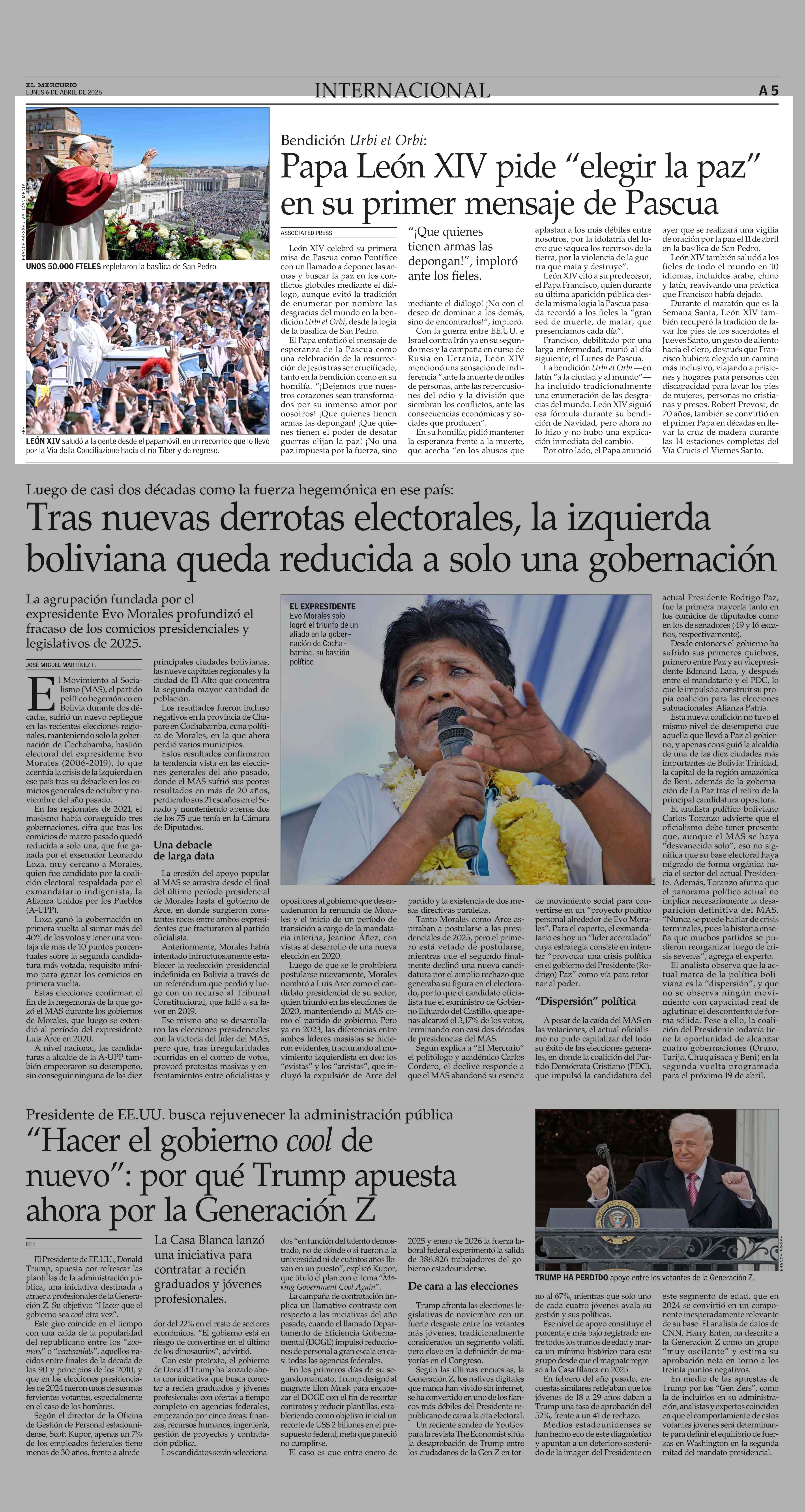 Papa León XIV pide “elegir la paz” en su primer mensaje de Pascua 06-04-2026 El Mercurio |