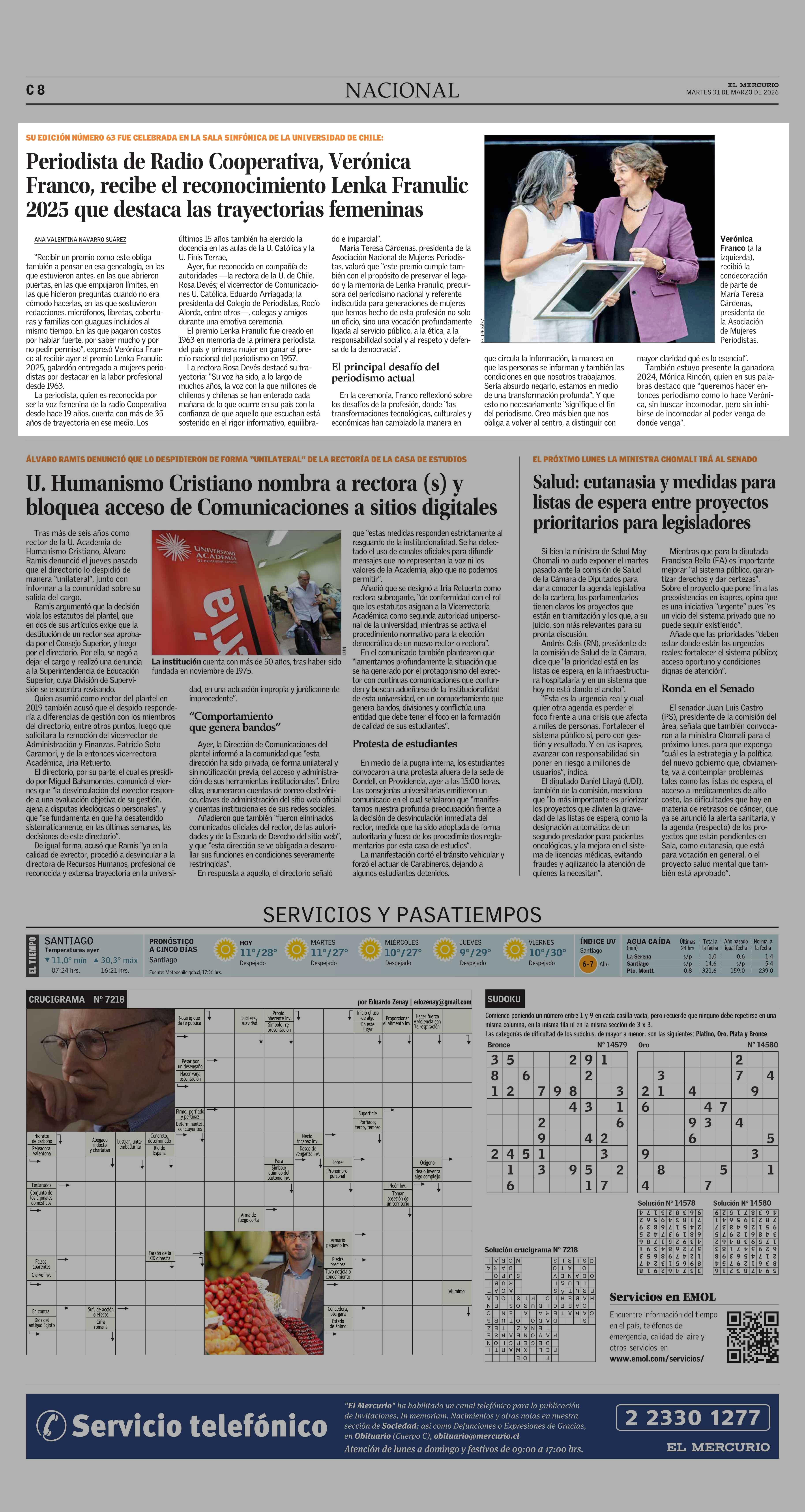 Periodista de Radio Cooperativa, Verónica Franco, recibe el reconocimiento Lenka Franulic 2025 que destaca las trayectorias femeninas 31-03-2026 El Mercurio |