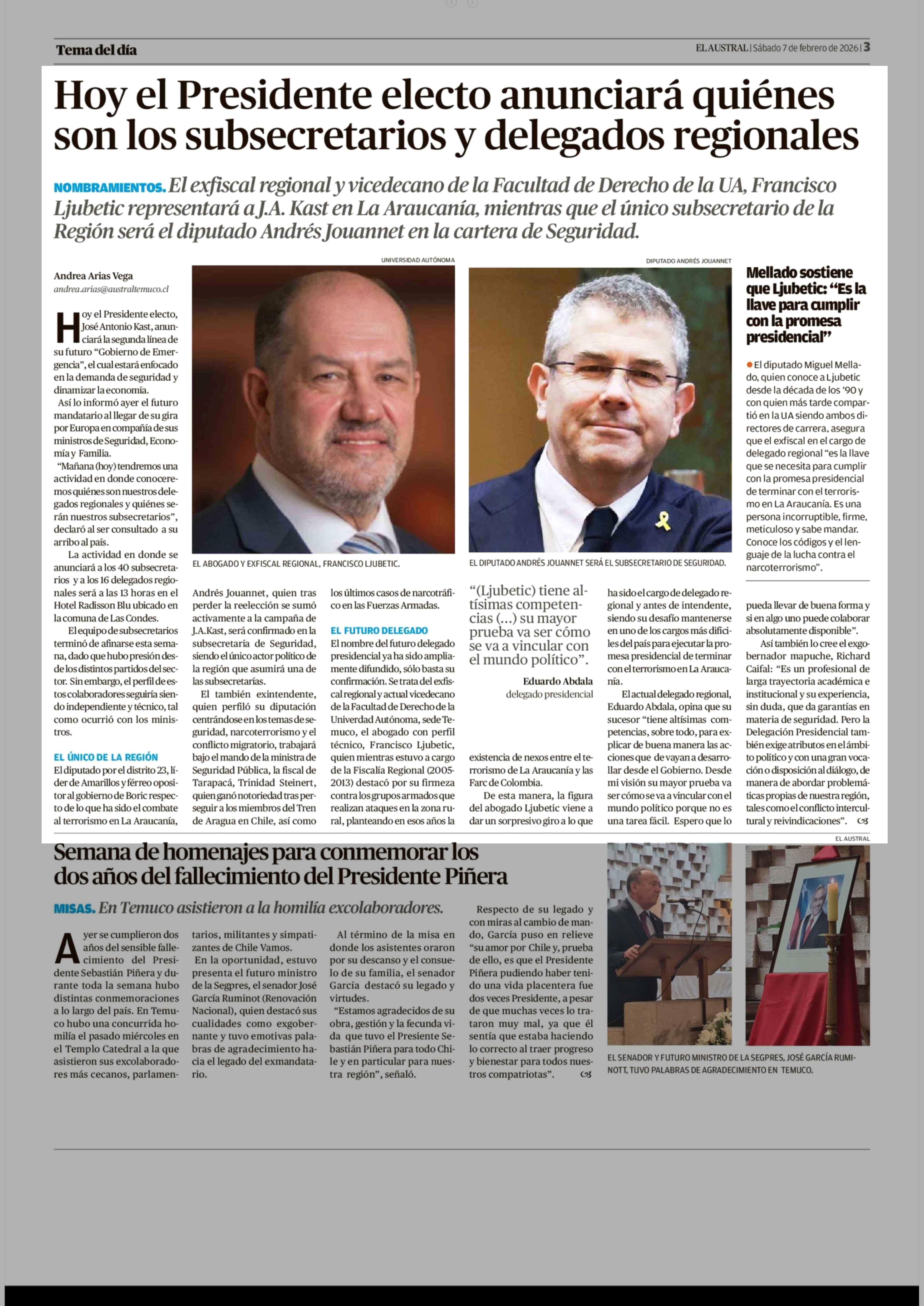 Hoy el Presidente electo anunciará quiénes son los subsecretarios y delegados regionales 07-02-2026 El Austral de la Araucanía |