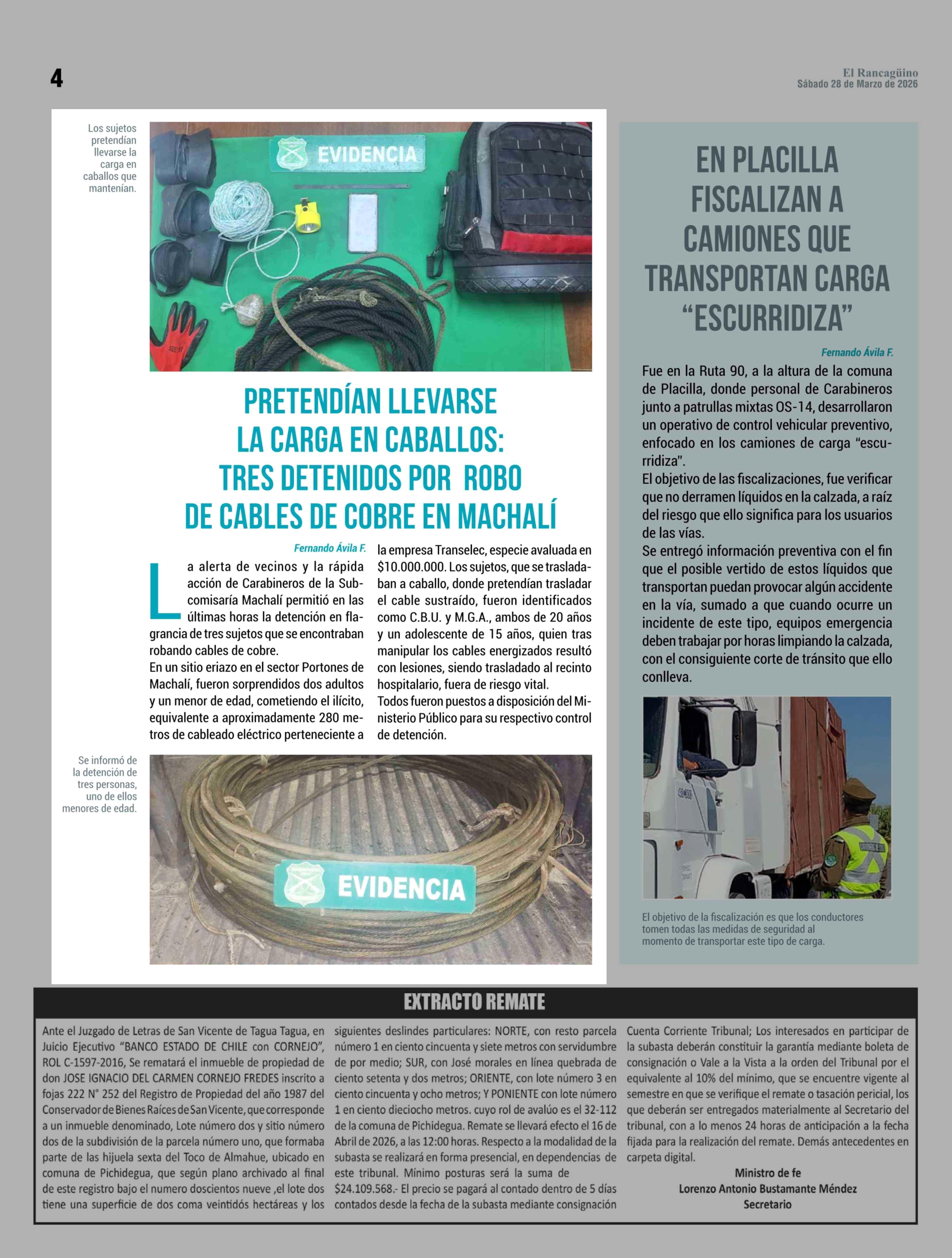 PRETENDÍAN LLEVARSE LA CARGA EN CABALLOS: TRES DETENIDOS POR ROBO DE CABLES DE COBRE EN MACHALÍ 28-03-2026 El Rancagüino |