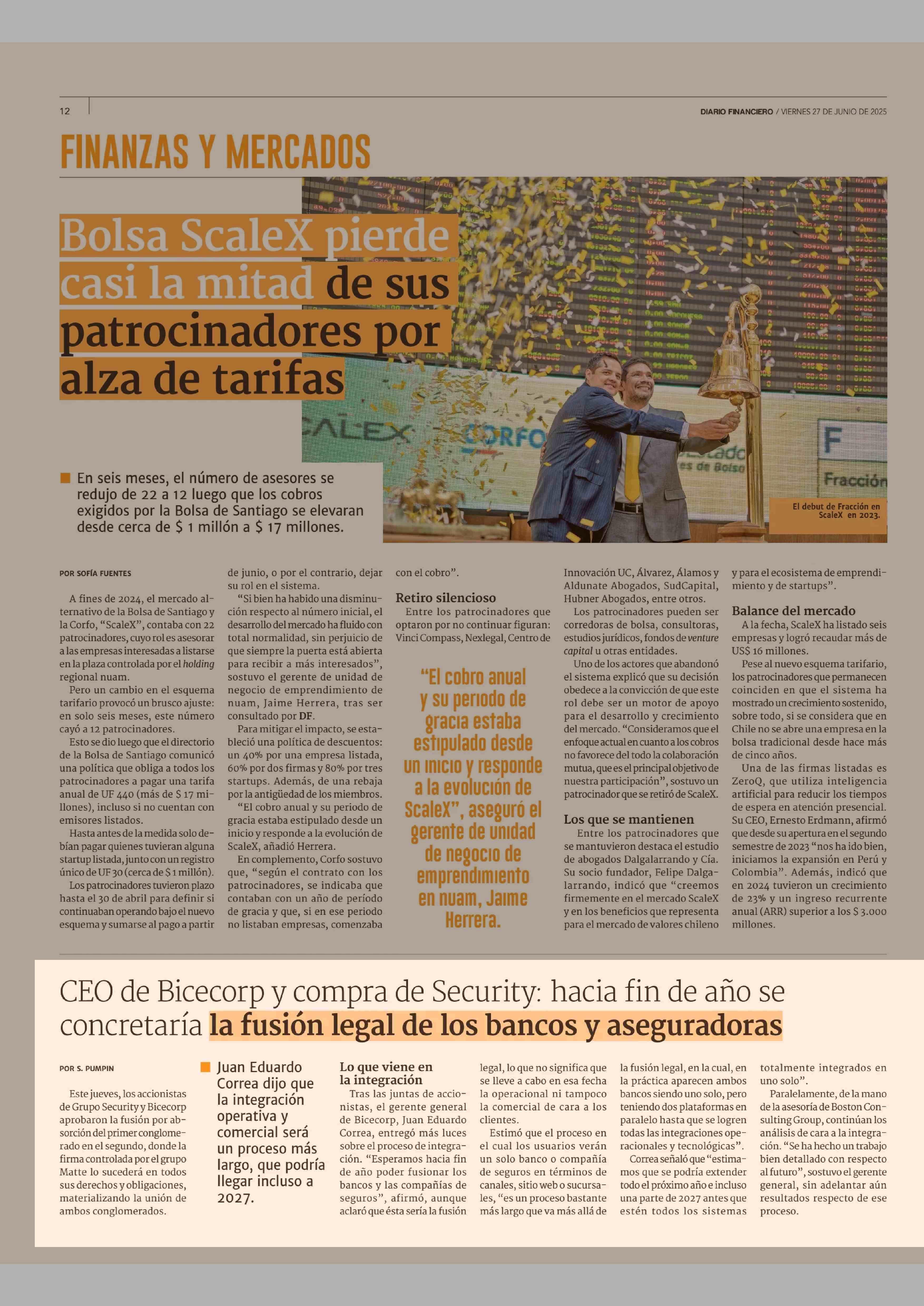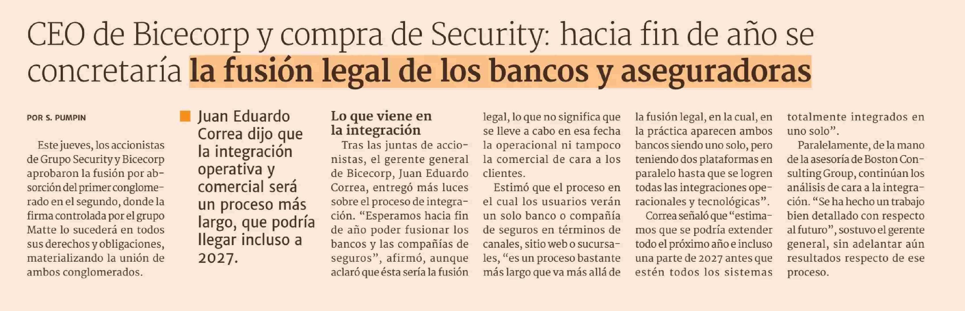 CEO de Bicecorp y compra de Security: hacia fin de año se concretaría la fusión legal de los bancos y aseguradoras 27-06-2025 Diario Financiero |