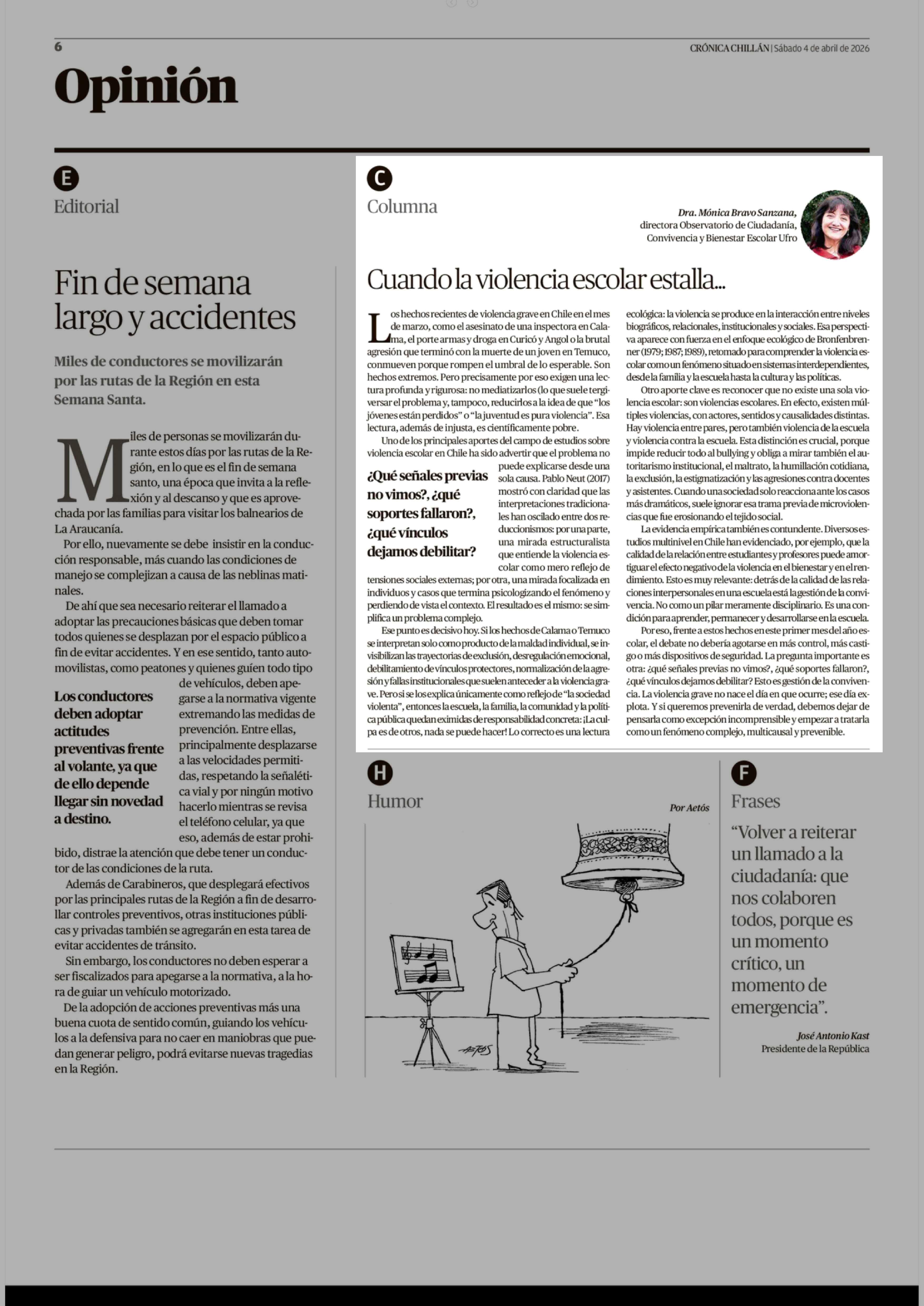 Columnas de Opinión: Cuando la violencia escolar estalla ... 04-04-2026 Crónica de Chillán |