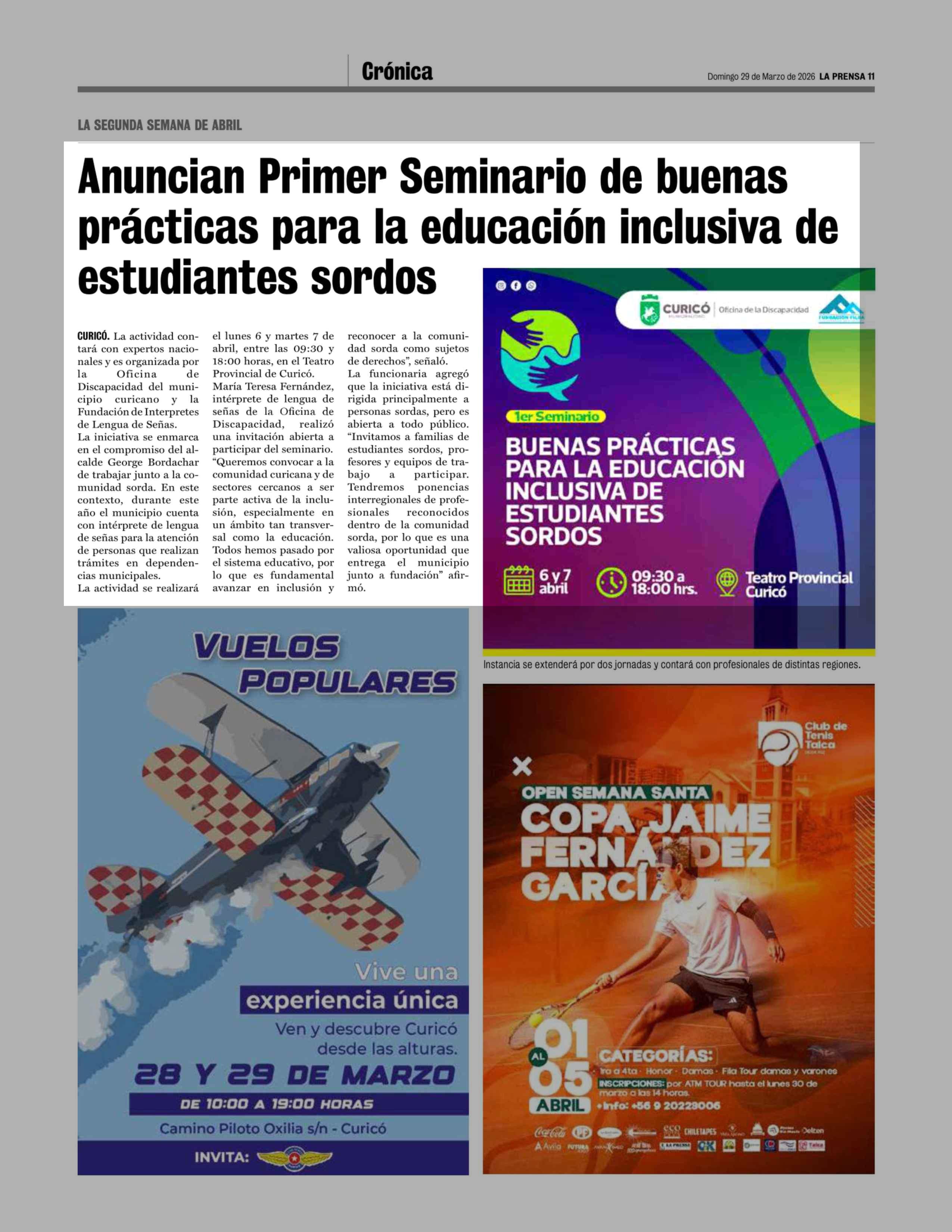 Anuncian Primer Seminario de buenas prácticas para la educación inclusiva de estudiantes sordos 29-03-2026 La Prensa de Curicó |