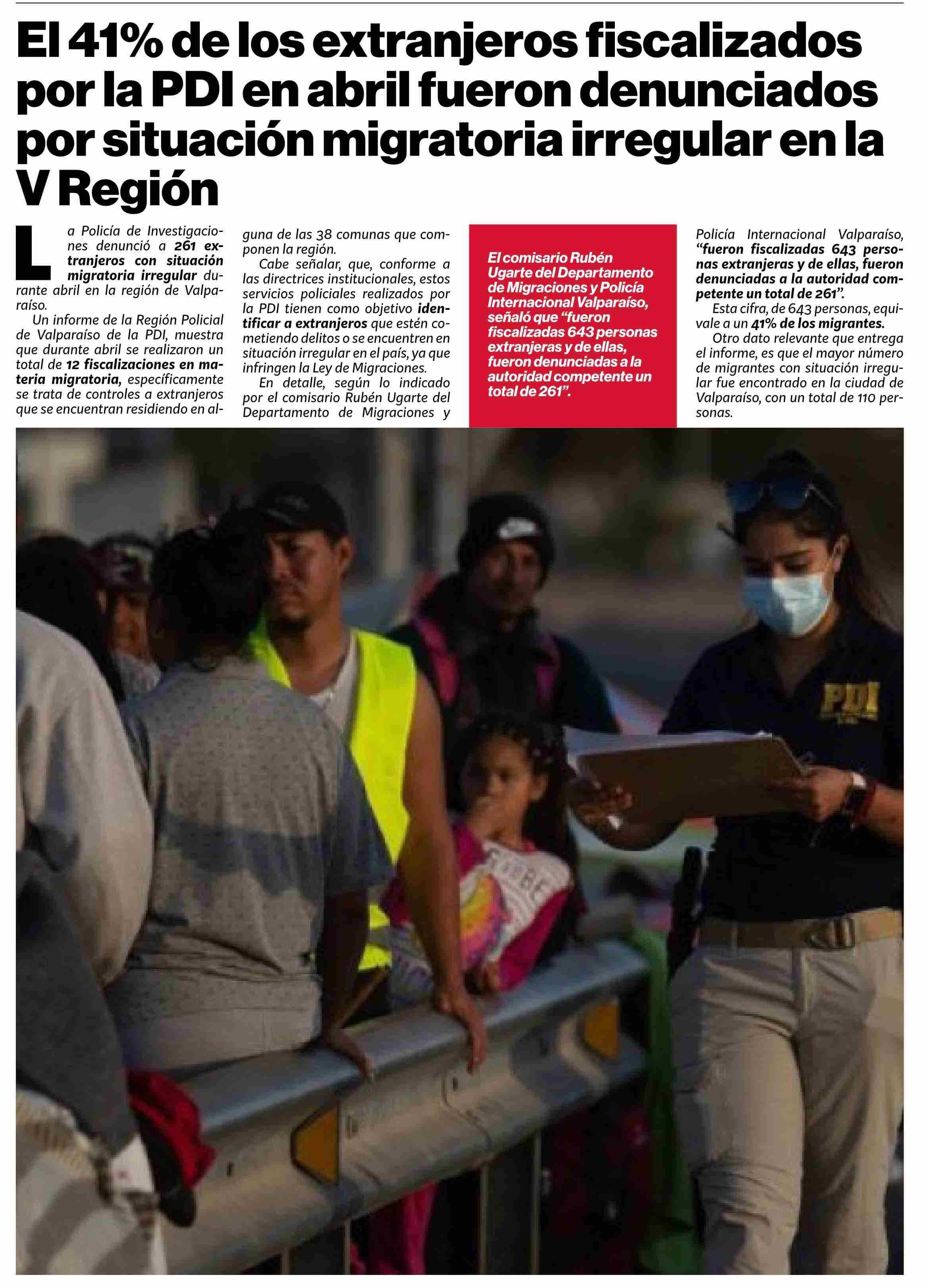 | Título: | El 41% de los extranjeros fiscalizados por la PDI en abril fueron denunciados por situación migratoria irregular en la V Región |