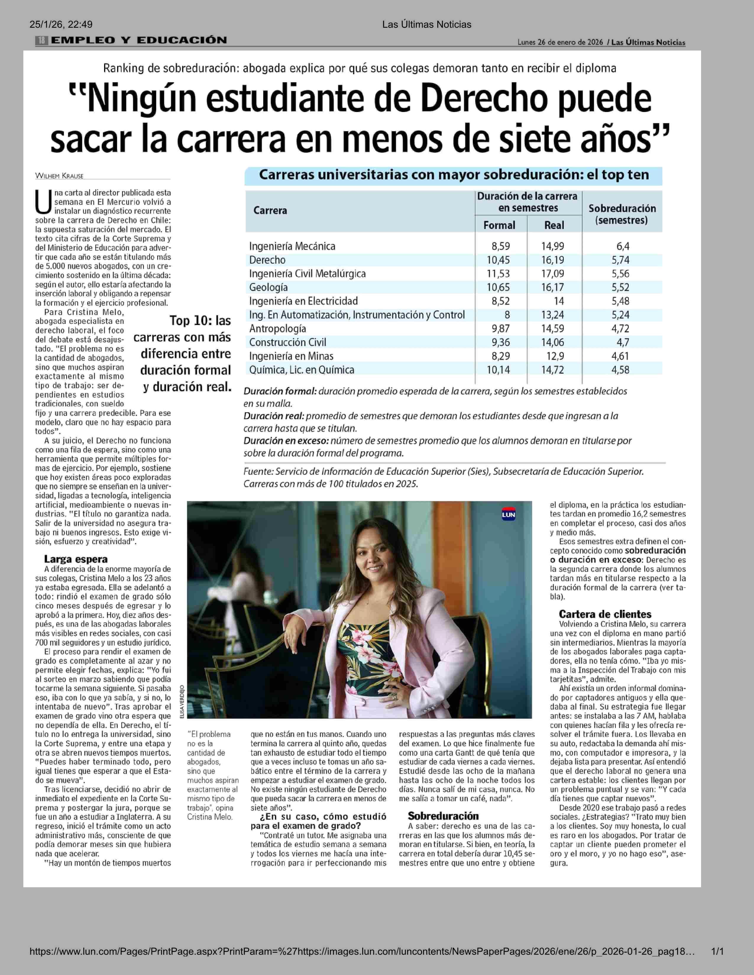 "Ningún estudiante de Derecho puede sacar la carrera en menos de siete años" 26-01-2026 Las Últimas Noticias |