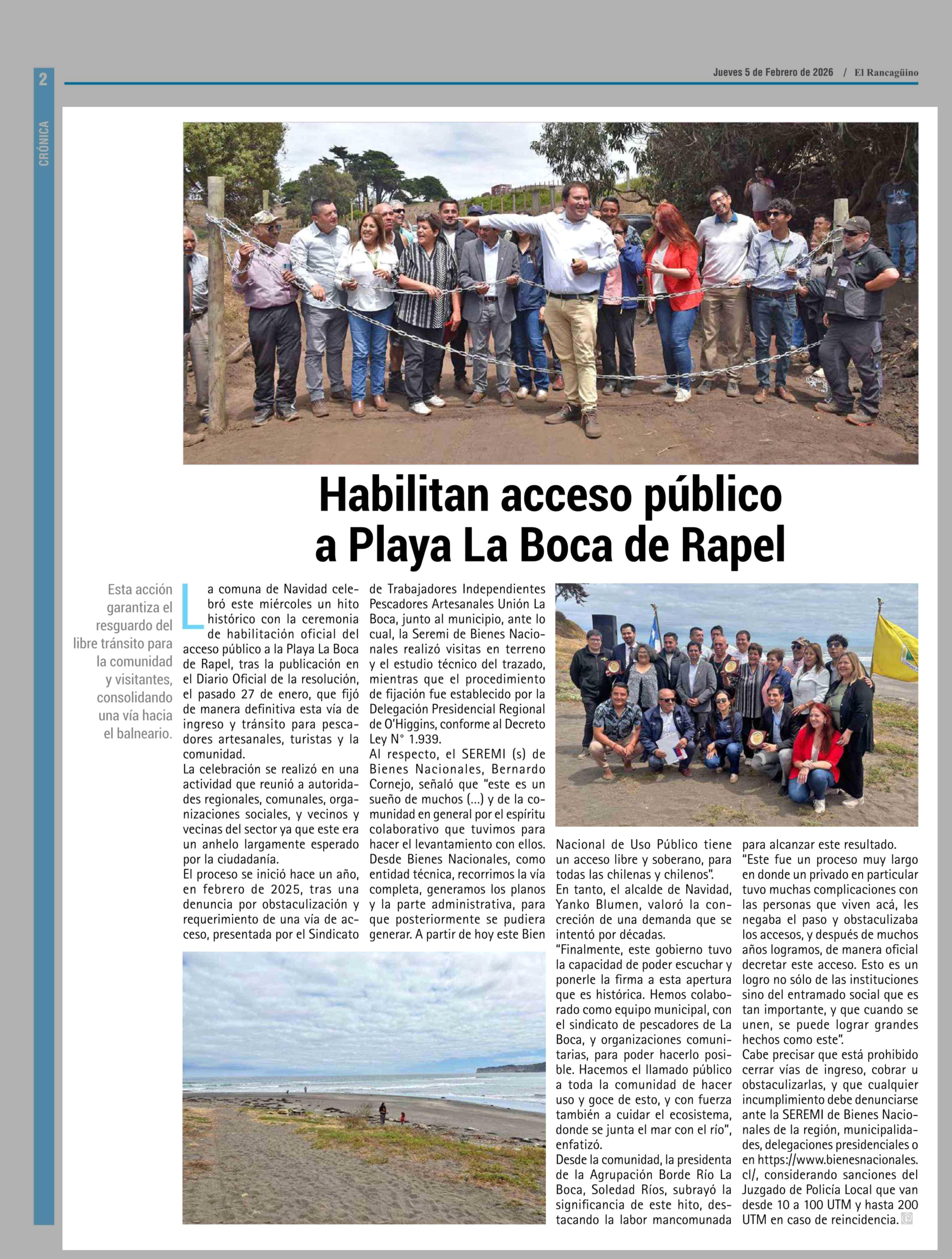 Habilitan acceso público a Playa La Boca de Rapel 05-02-2026 El Rancagüino |