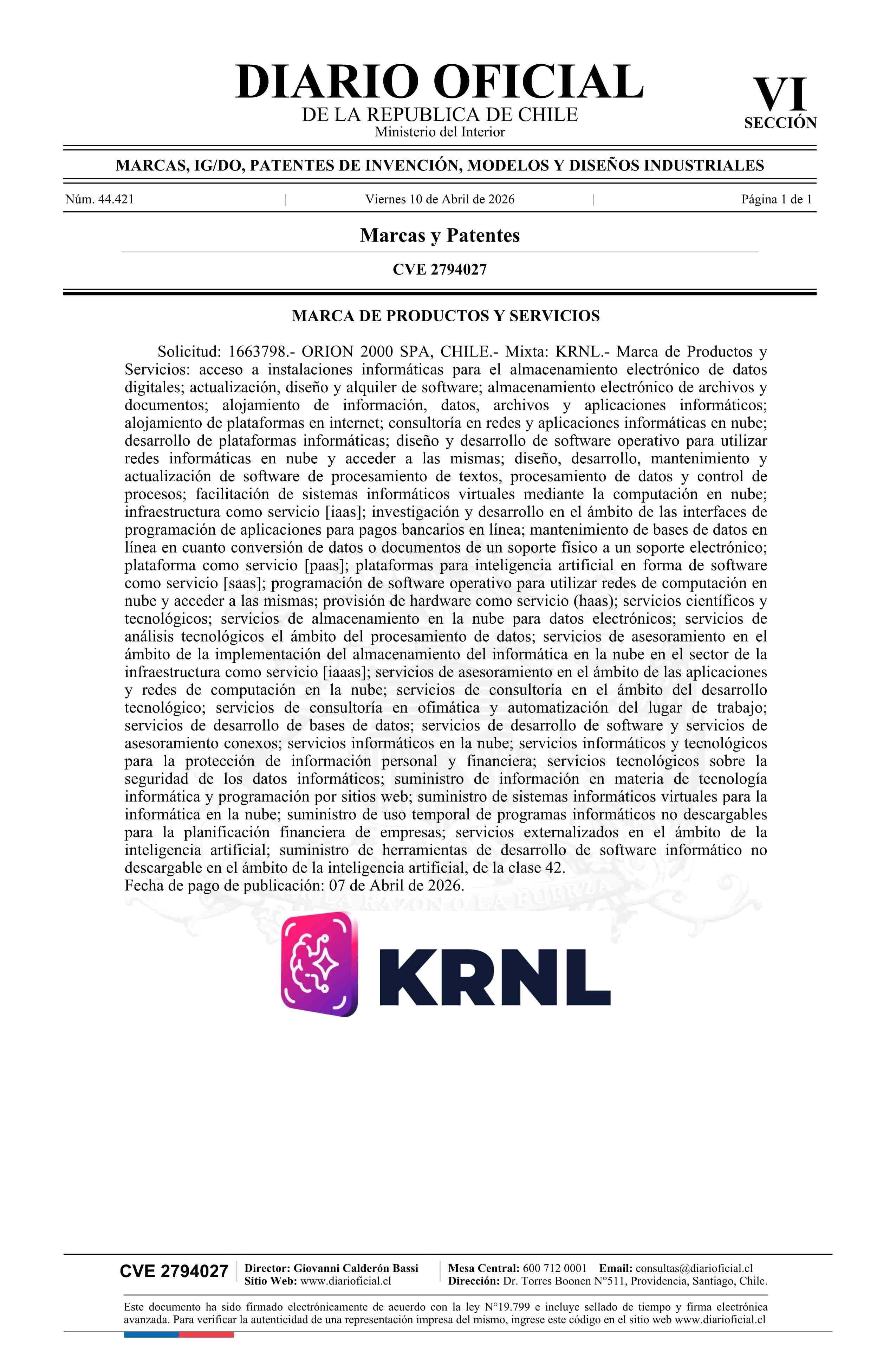 Solicitud número 1663798.- KRNL 10-04-2026 Diario Oficial Edición Electrónica |