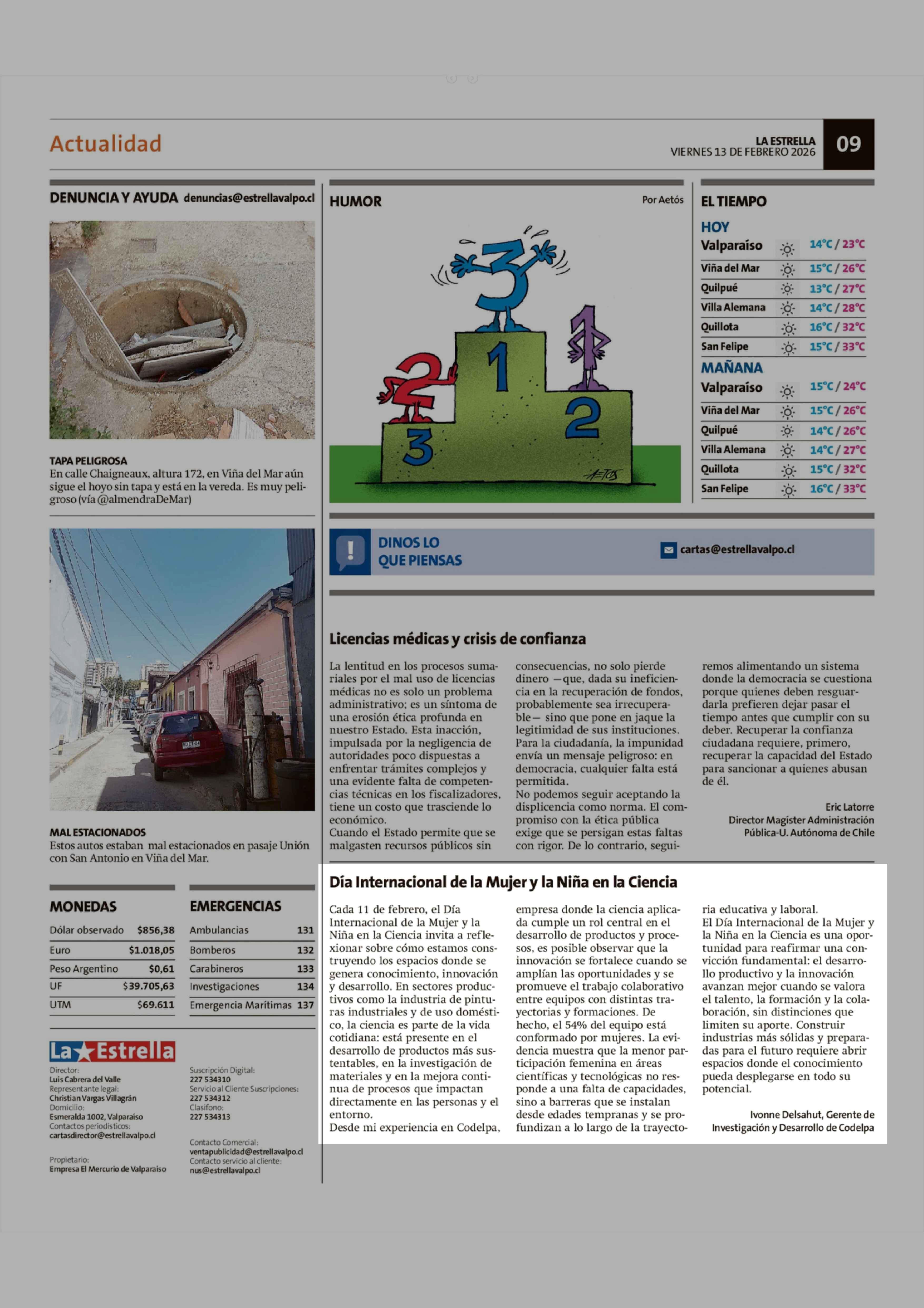 Cartas: Día Internacional de la Mujer y la Niña en la Ciencia 13-02-2026 La Estrella de Valparaíso |