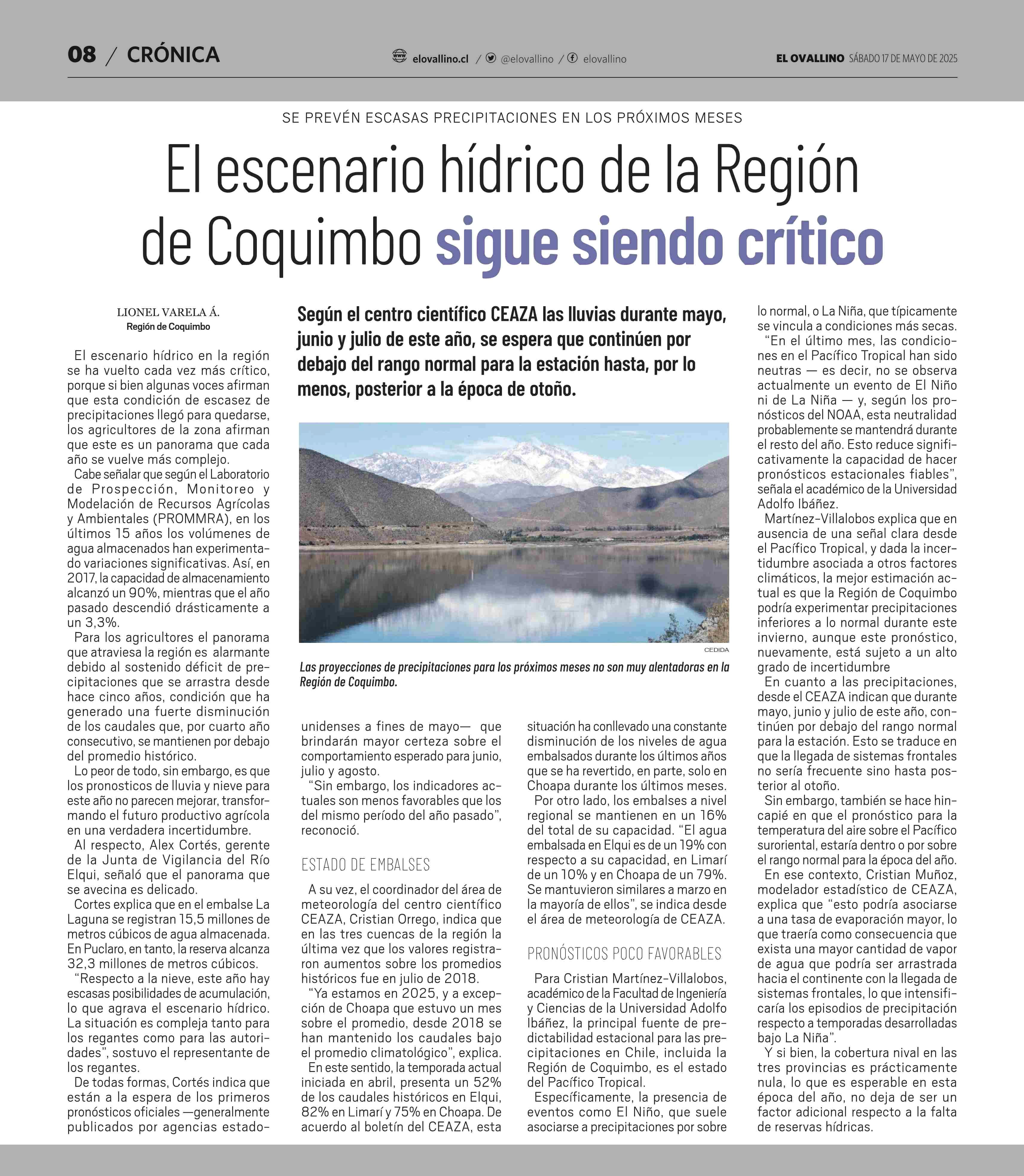 El escenario hídrico de la Región de Coquimbo sigue siendo crítico 17-05-2025 El Ovallino |