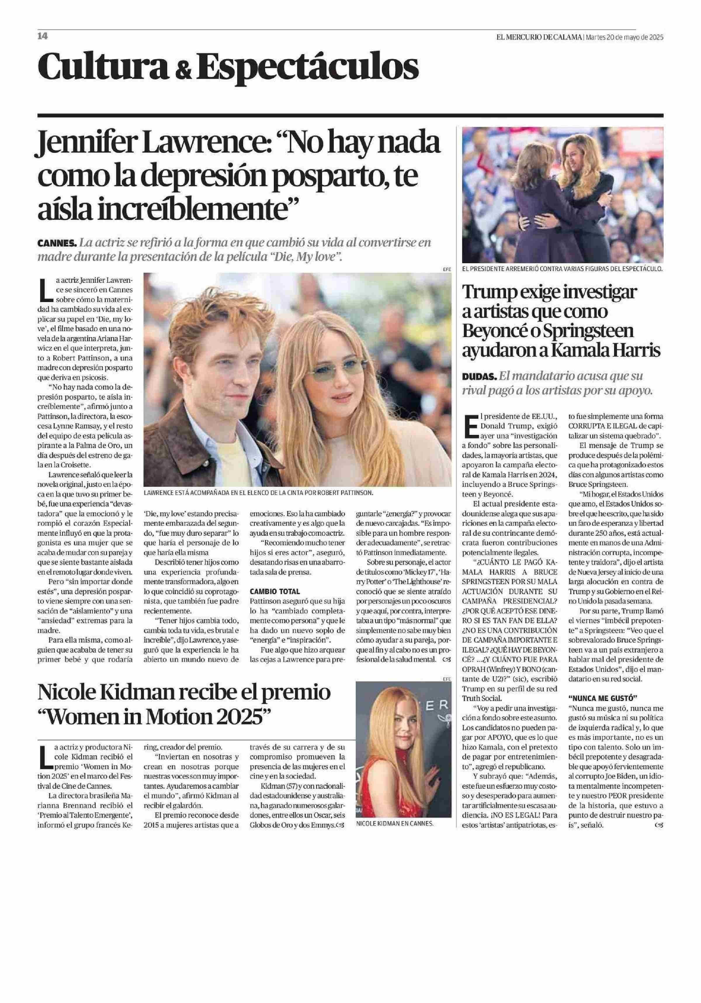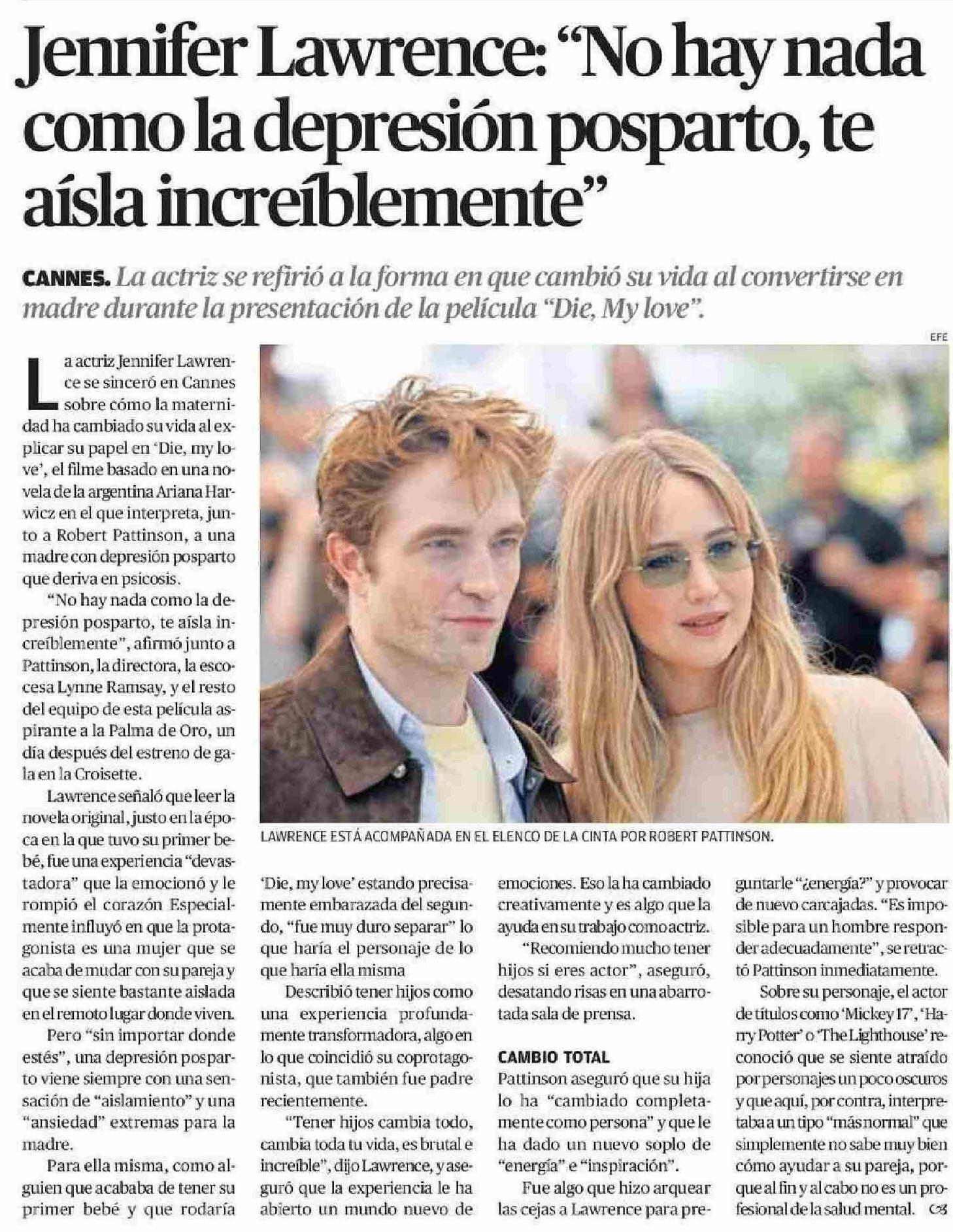 Jennifer Lawrence: “No hay nada como la depresión posparto, te aísla increiblemente” 20-05-2025 El Mercurio de Calama |