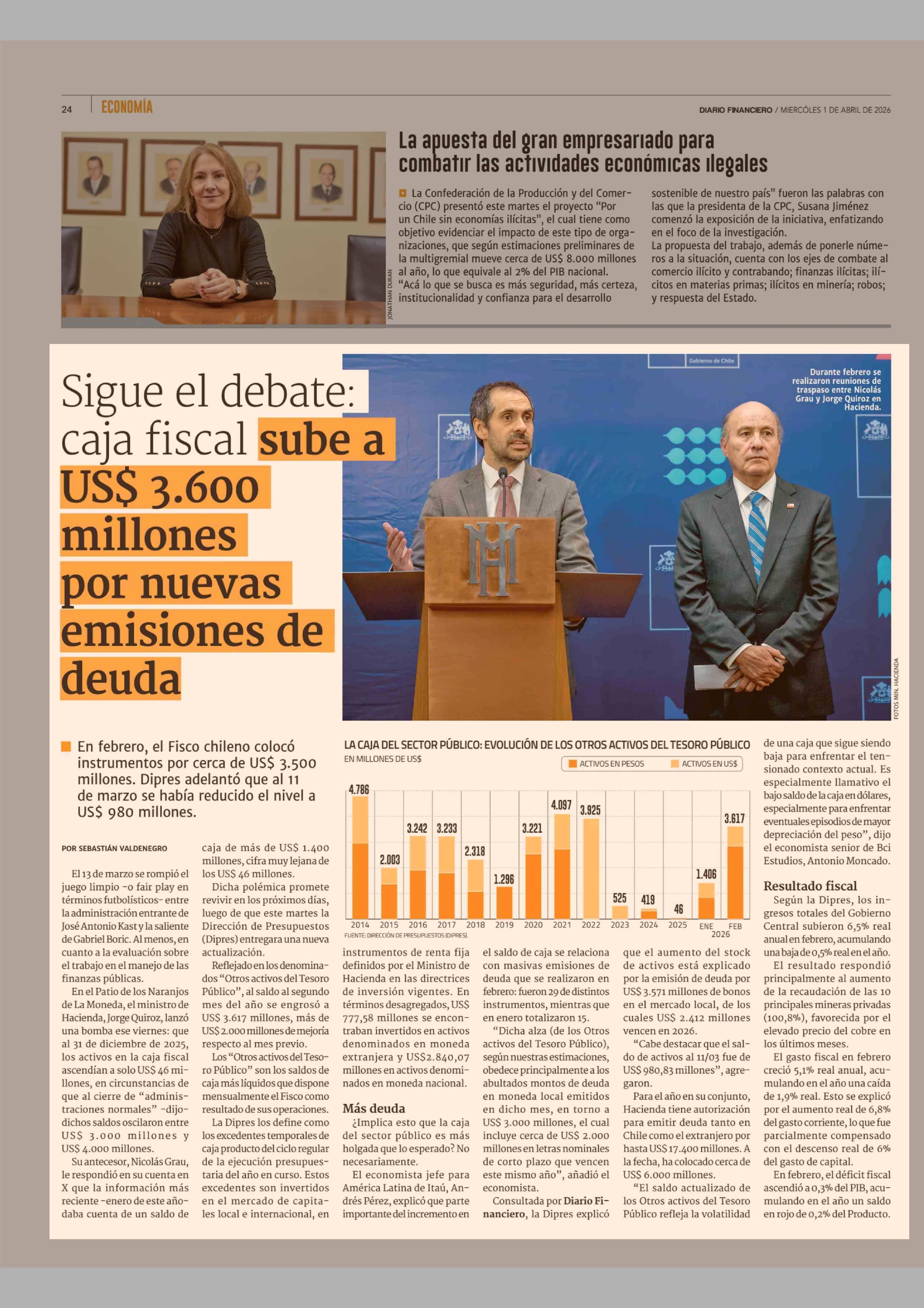 Sigue el debate: caja fiscal sube a US$ 3.600 millones por nuevas emisiones de deuda 01-04-2026 Diario Financiero |