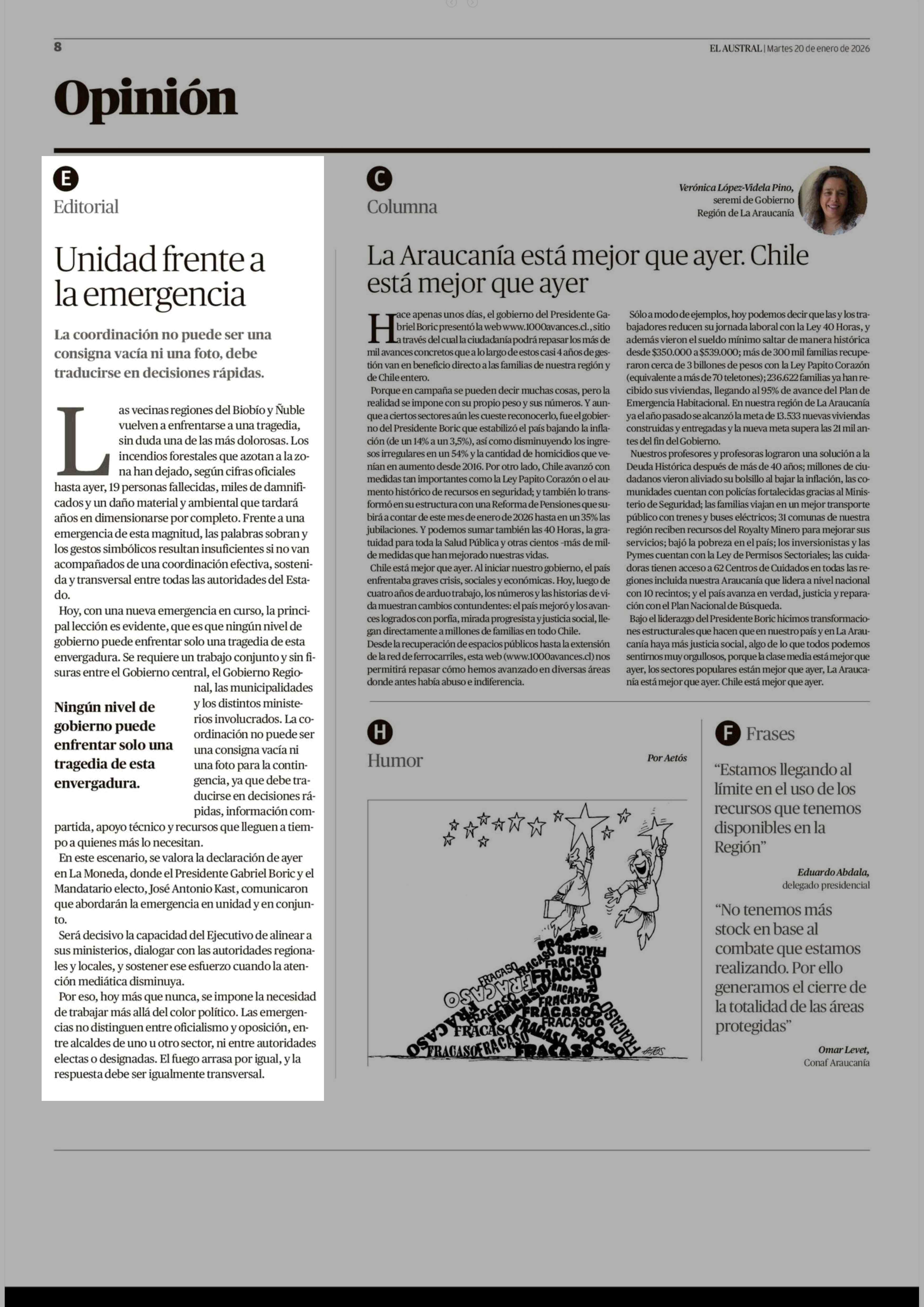 Editorial: Unidad frente a la emergencia 20-01-2026 El Austral de la Araucanía |