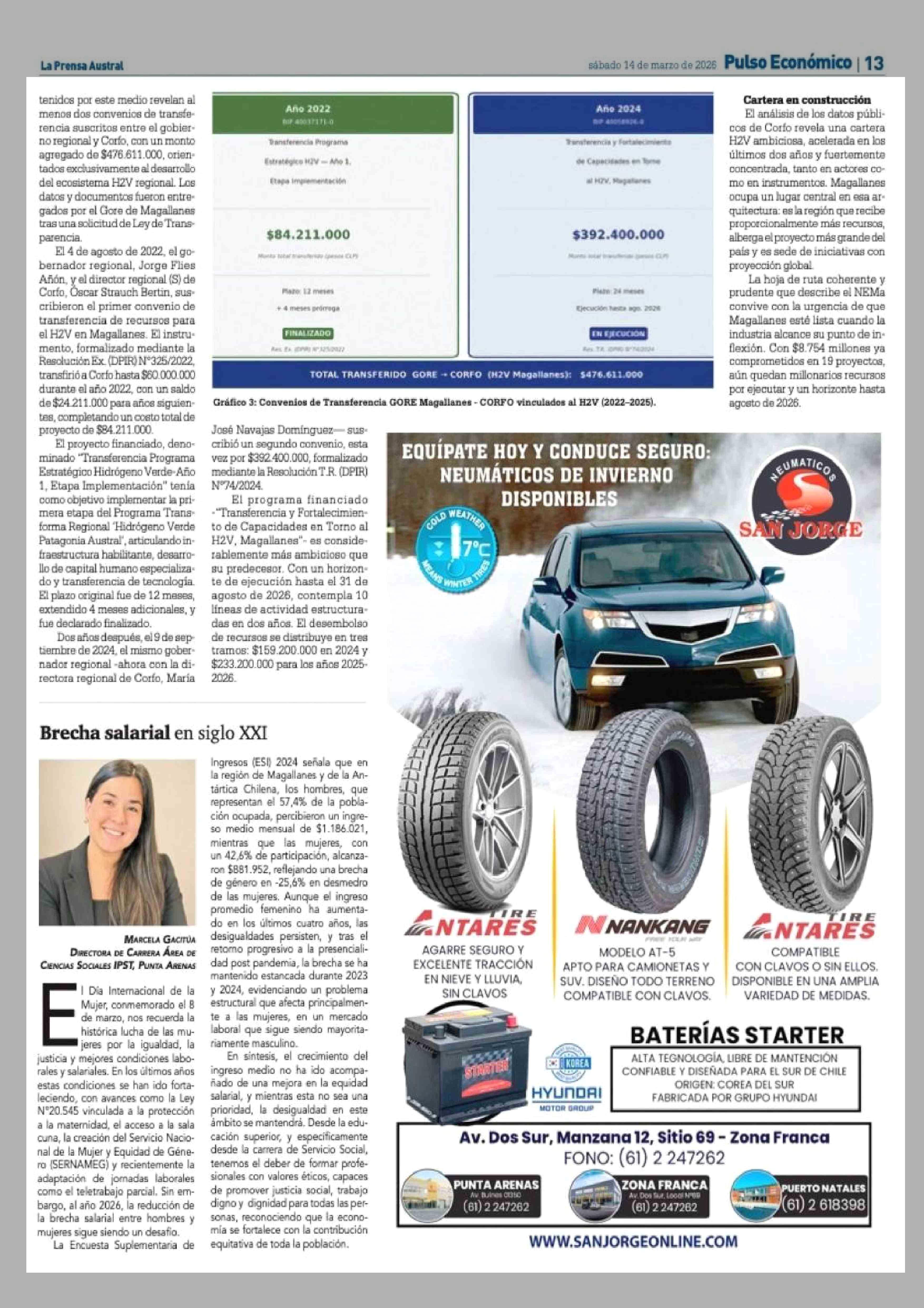 | Título: | tenidos por este medio revelan al menos dos convenios de transferencia suscritos entre el gobierno regional y Corfo, con un monto agregado de $476.611.000, orientados exclusivamente al desarrollo del ecosistema H2V regional. Los datos y documentos fueron entregados por el Gore de Magallanes tras una |