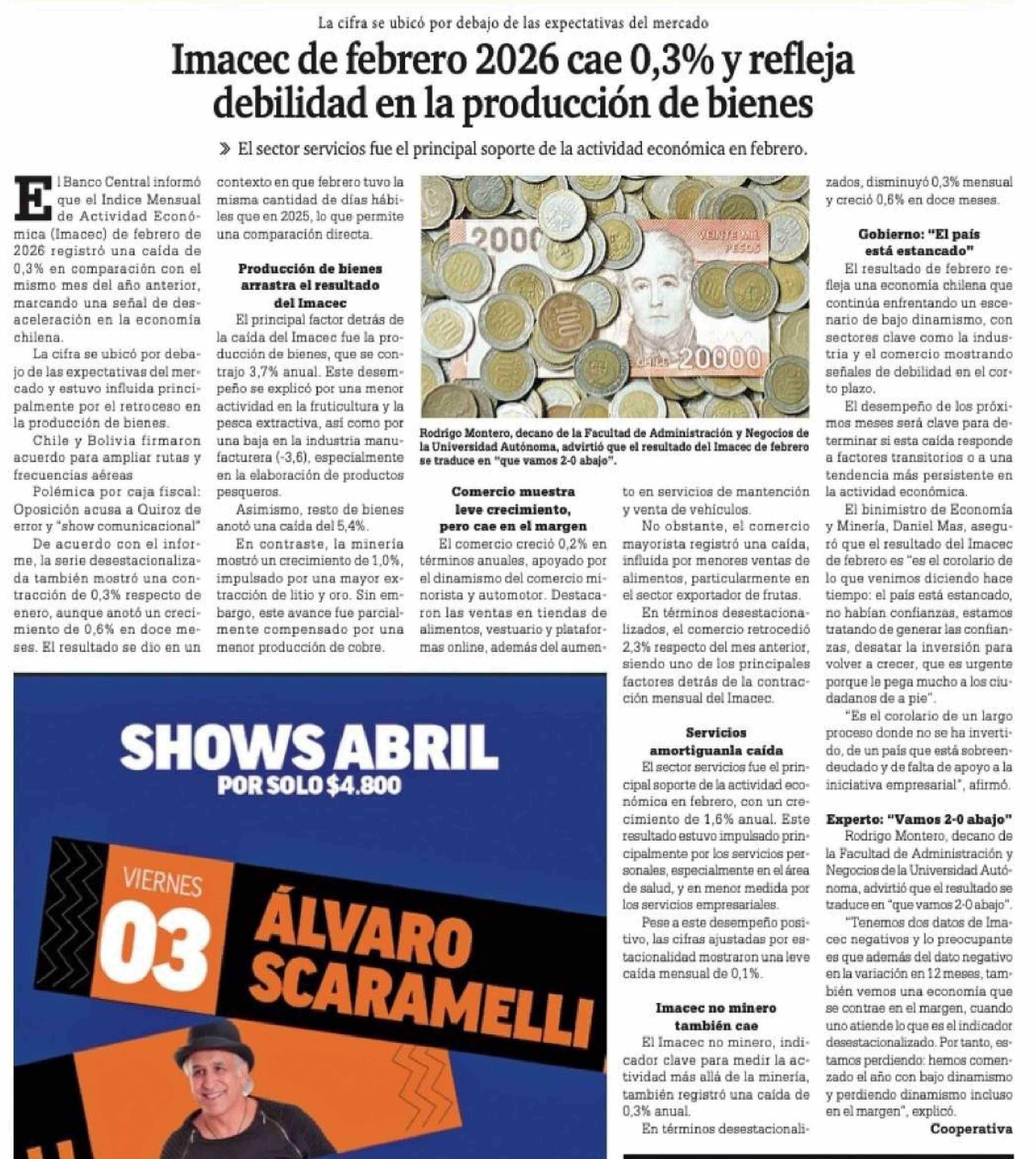 Imacec de febrero 2026 cae 0,3% y refleja debilidad en la producción de bienes 02-04-2026 La Prensa Austral |