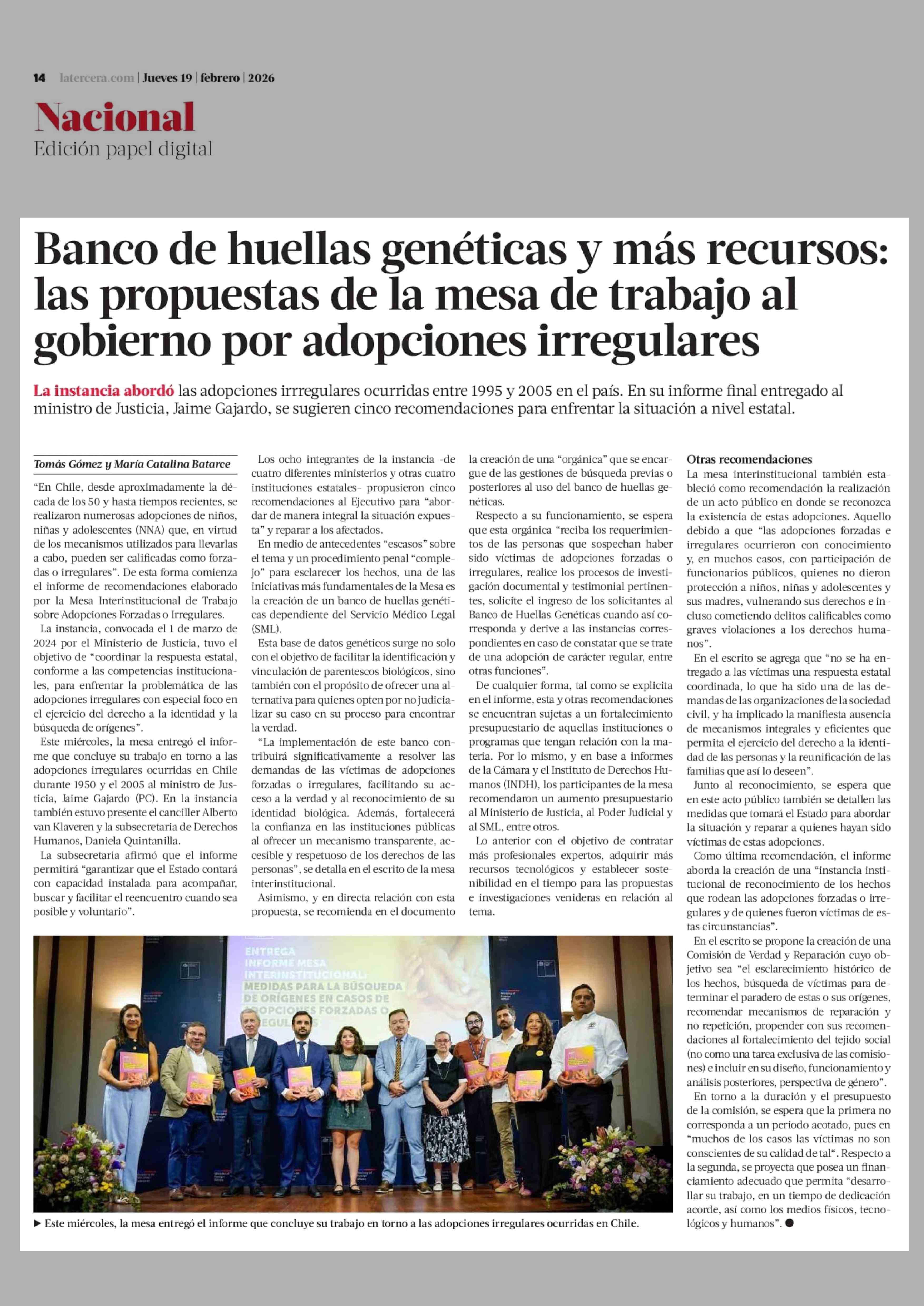Título: Banco de huellas genéticas y más recursos: las propuestas de la mesa de trabajo al gobierno por adopciones irregulares
