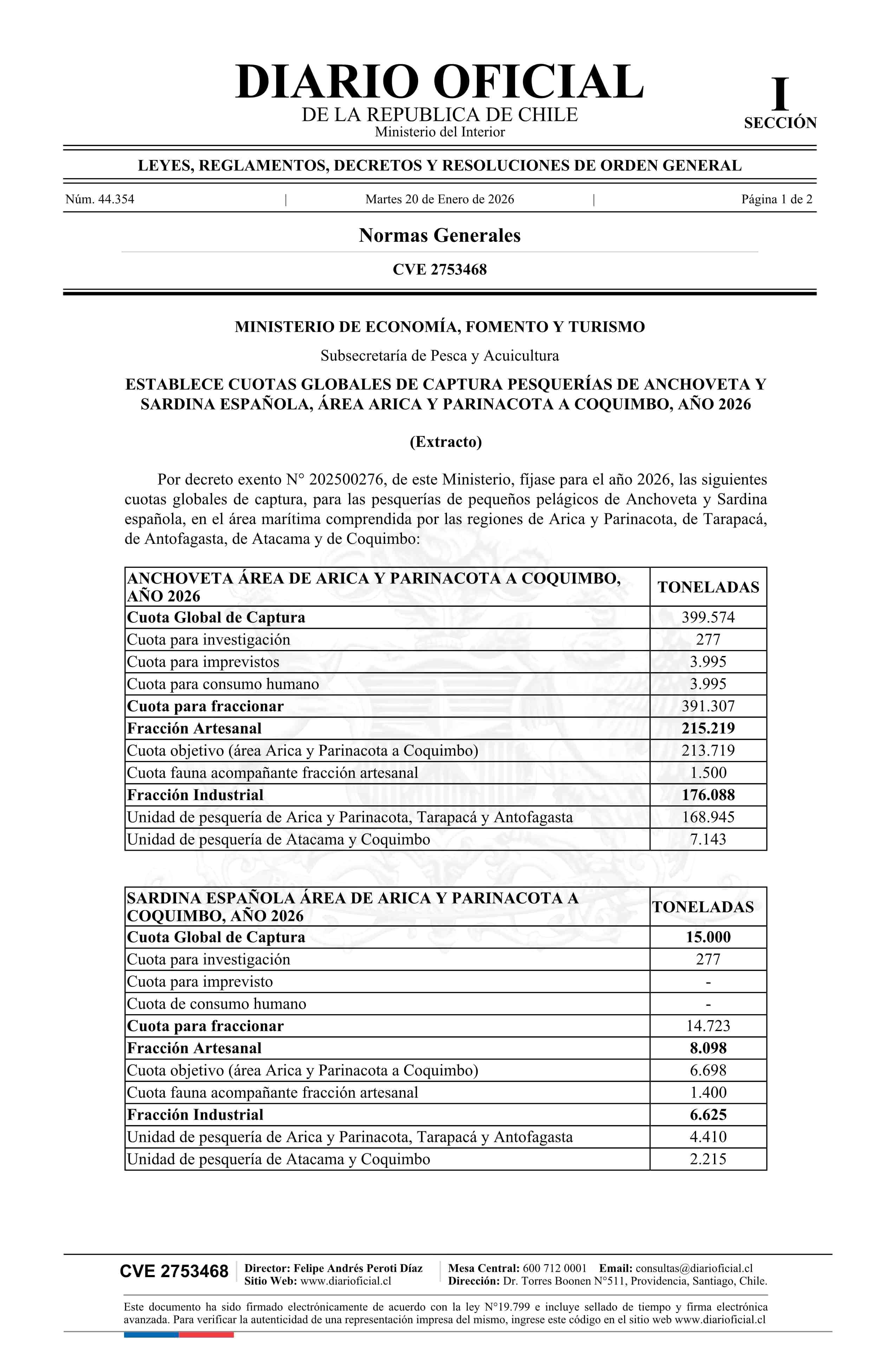 Extracto de decreto exento número 202500276, de 2025.- Establece cuotas globales de captura pesquerías de Anchoveta y Sardina española, área Arica y Parinacota a Coquimbo, año 2026