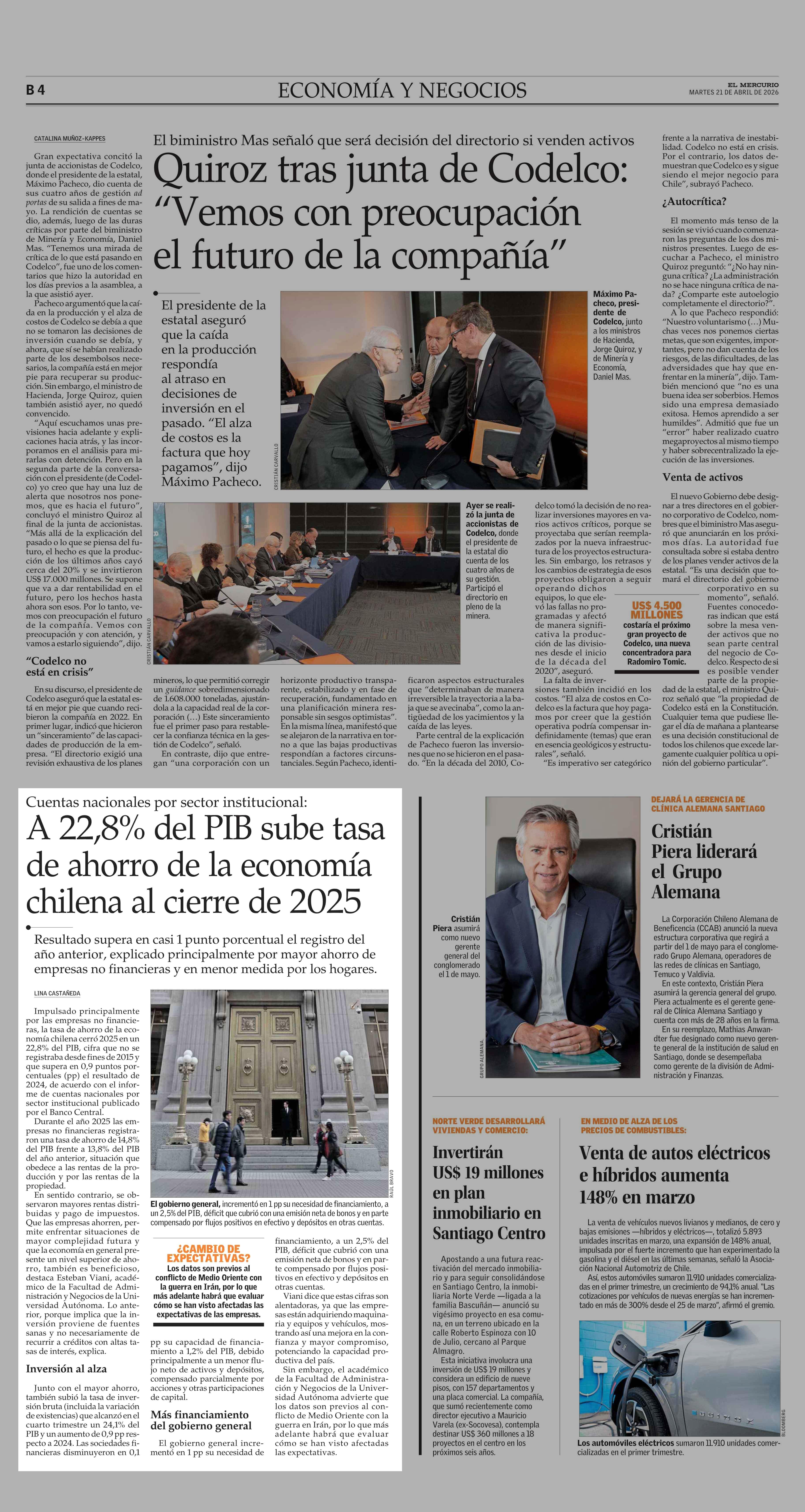 A 22,8% del PIB sube tasa de ahorro de la economía chilena al cierre de 2025 21-04-2026 El Mercurio |
