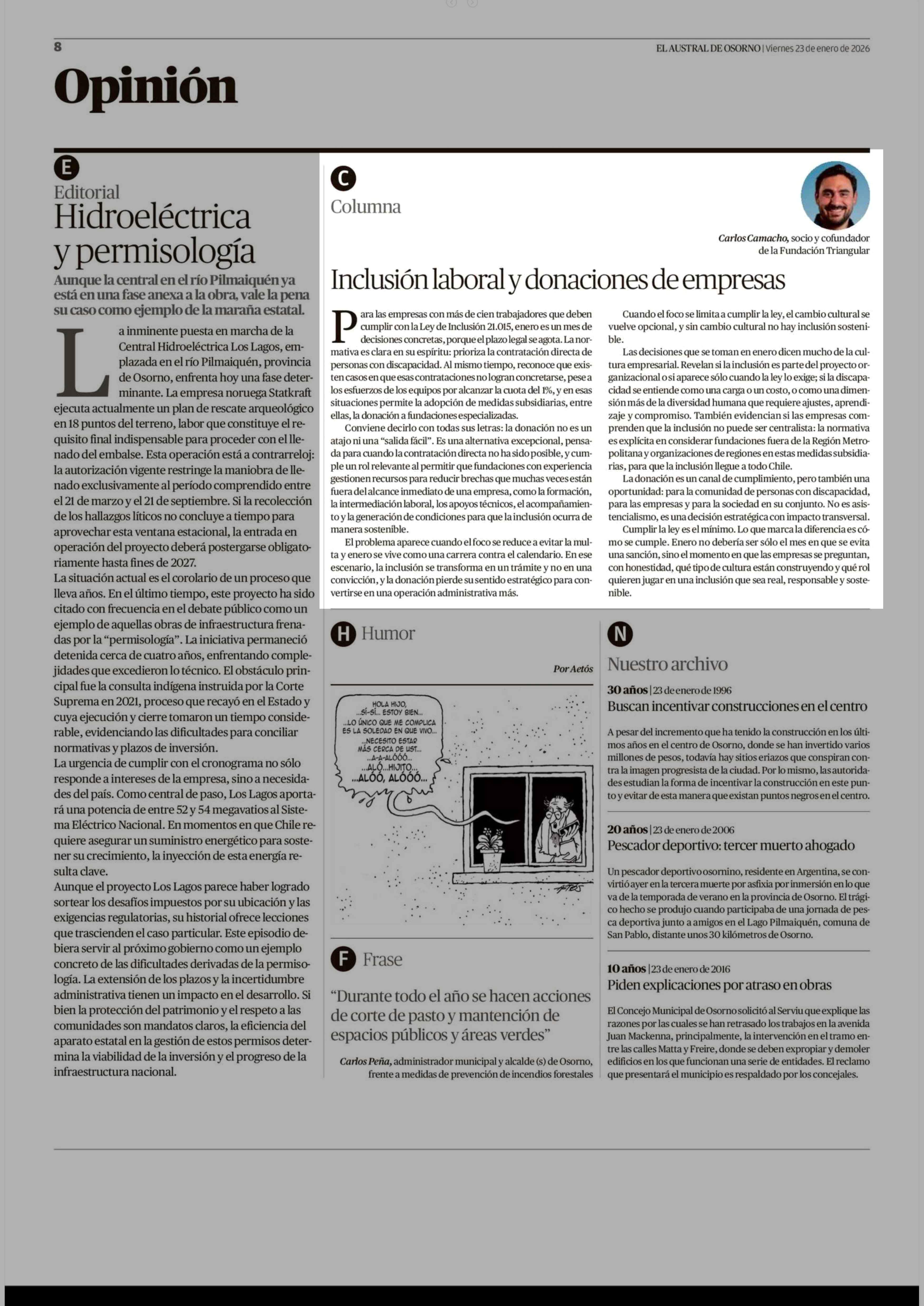 Columnas de Opinión: Inclusión laboral y donaciones de empresas 23-01-2026 El Austral de Osorno |