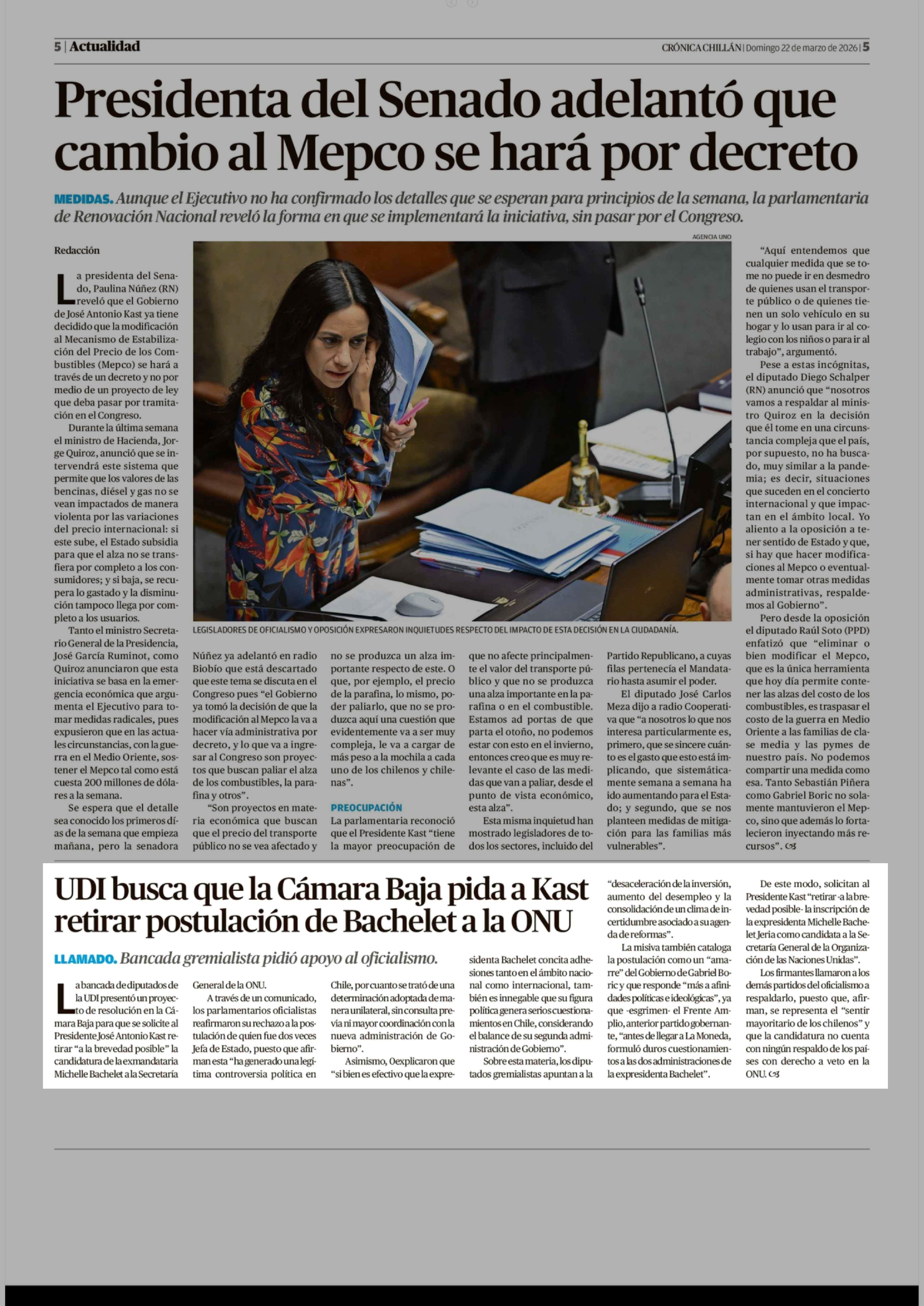 UDI busca que la Cámara Baja pida a Kast retirar postulación de Bachelet a la ONU 22-03-2026 Crónica de Chillán |