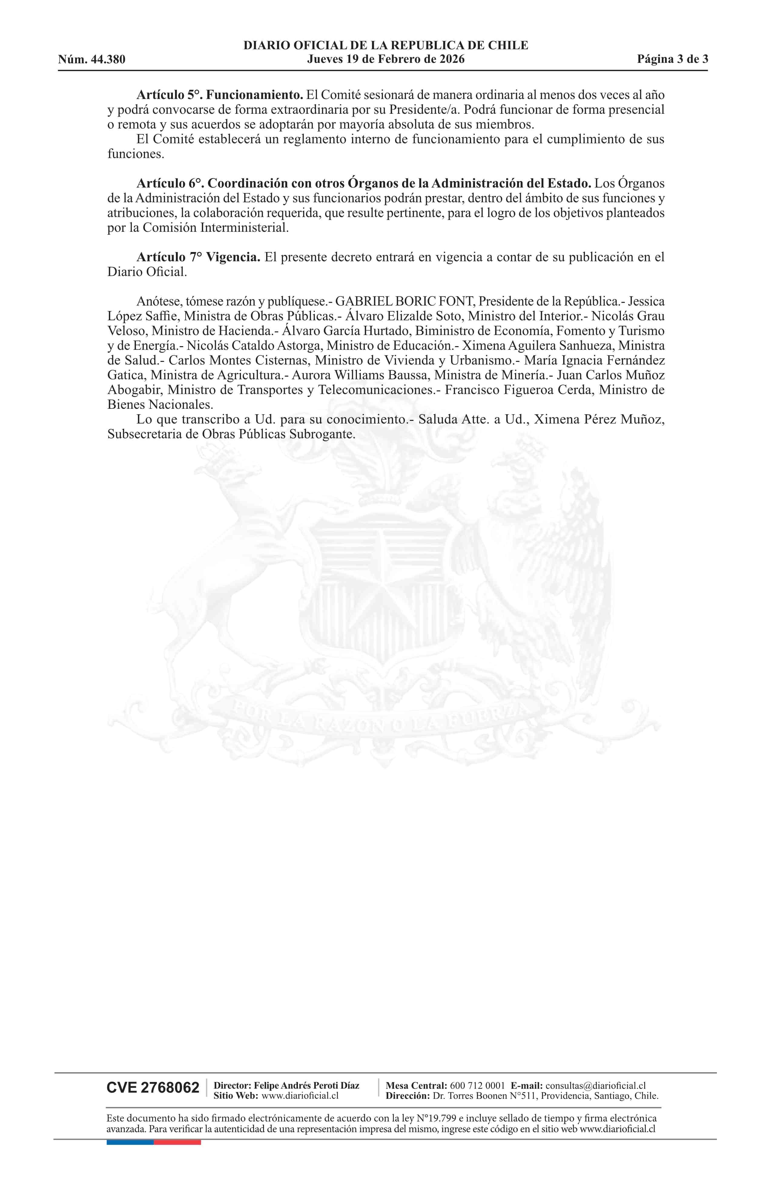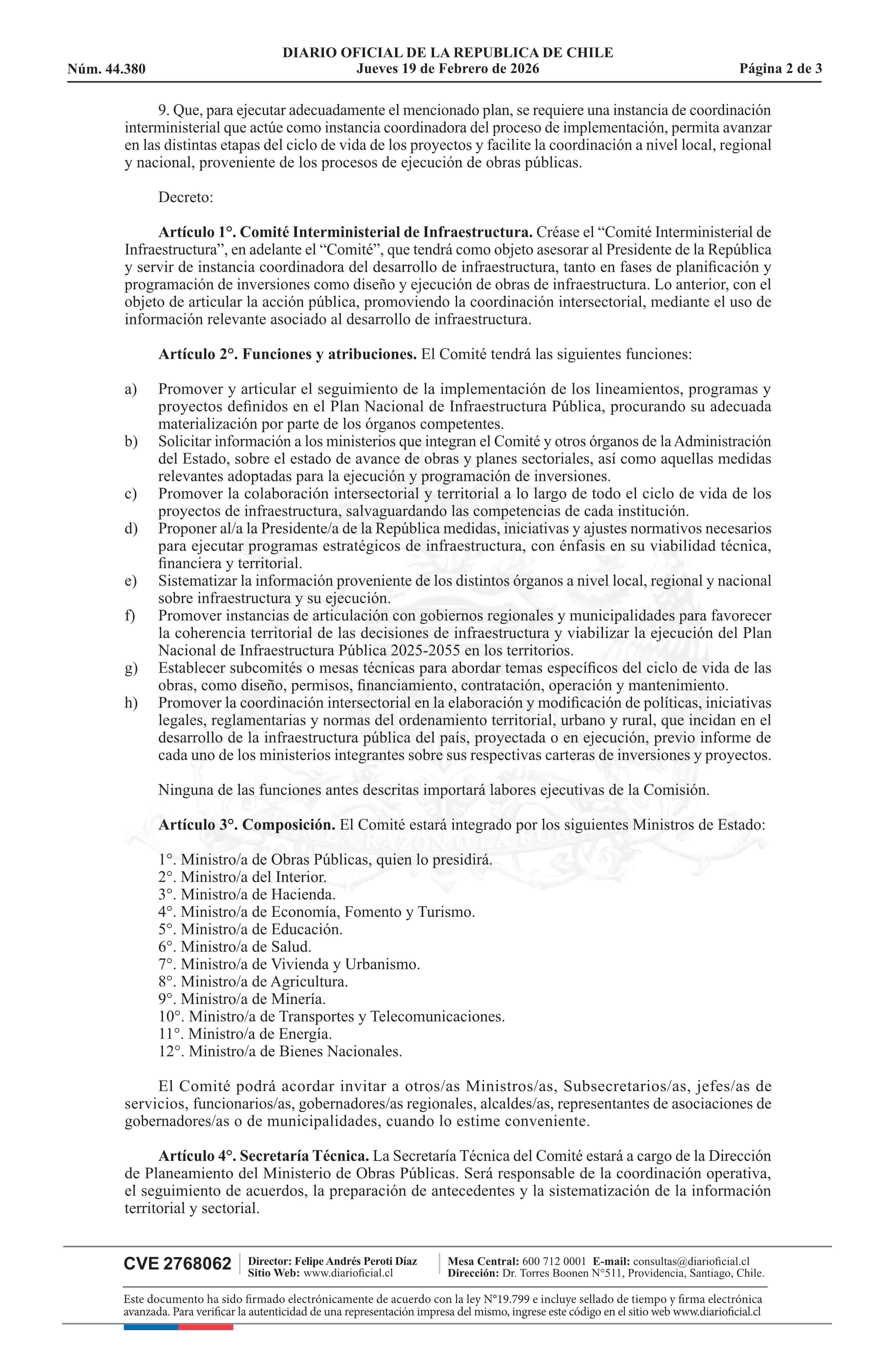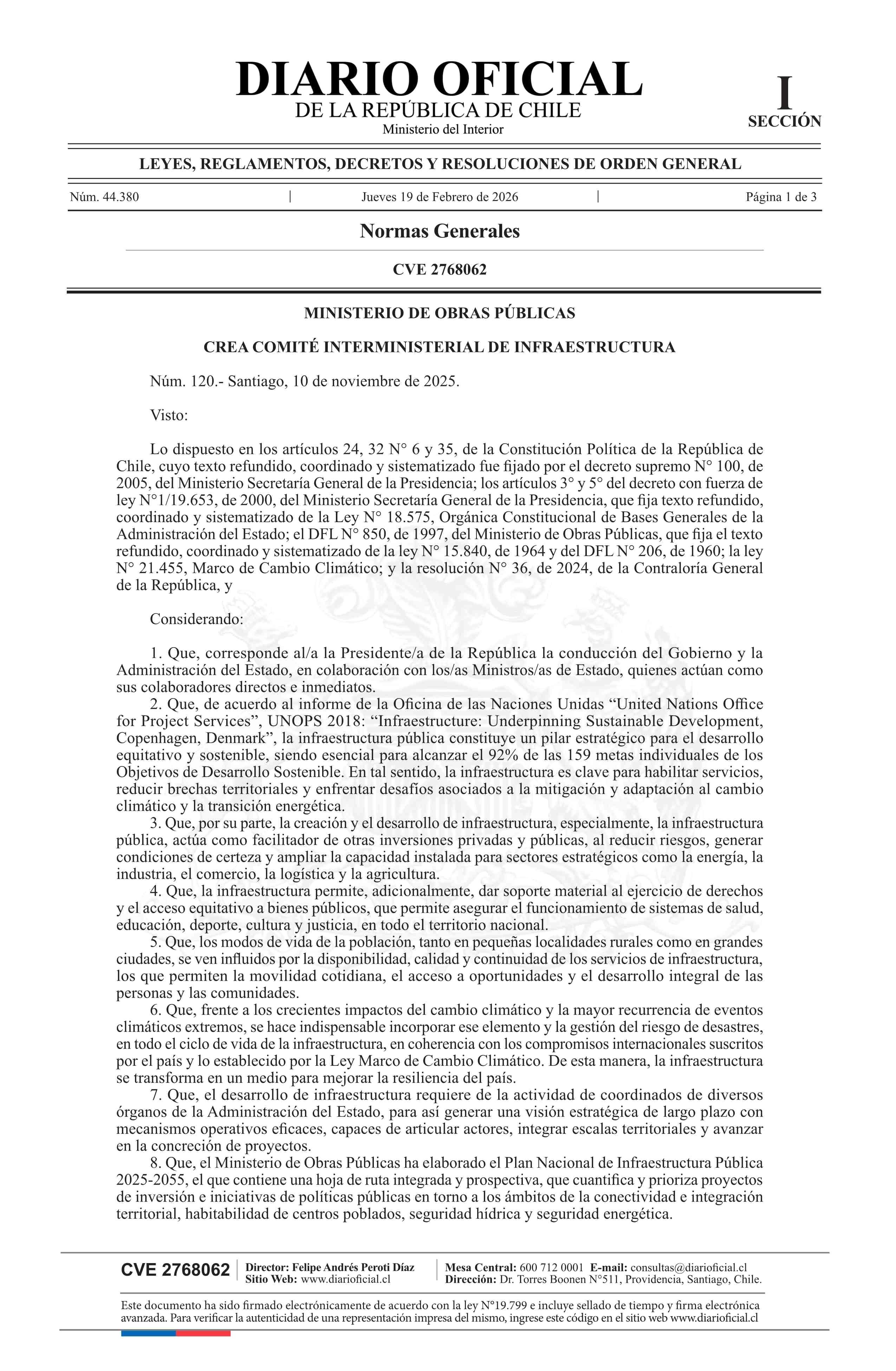 Decreto número 120, de 2025.- Crea Comité Interministerial de Infraestructura 19-02-2026 Diario Oficial Edición Electrónica |