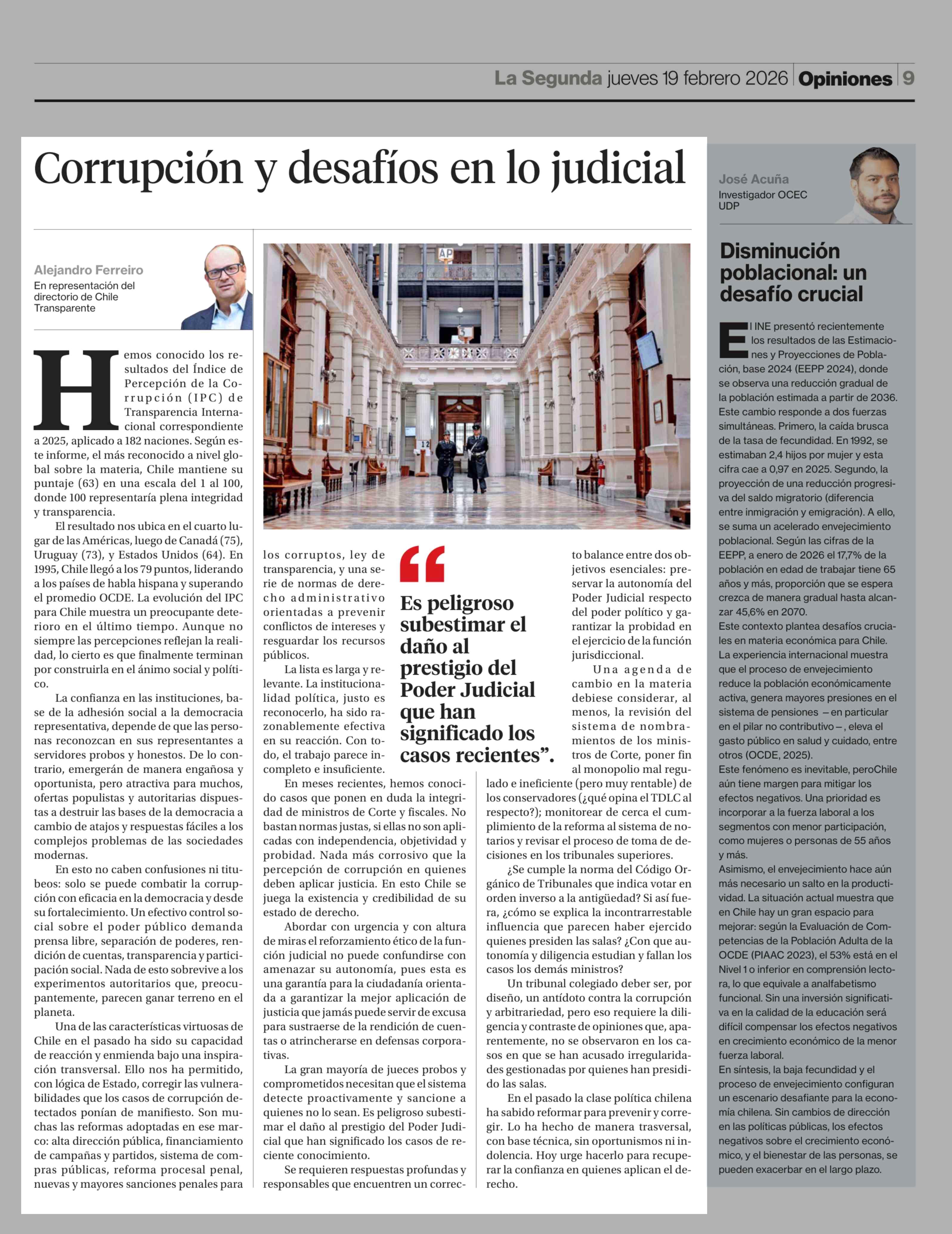 Columnas de Opinión: Corrupción y desafíos en lo judicial 19-02-2026 La Segunda |