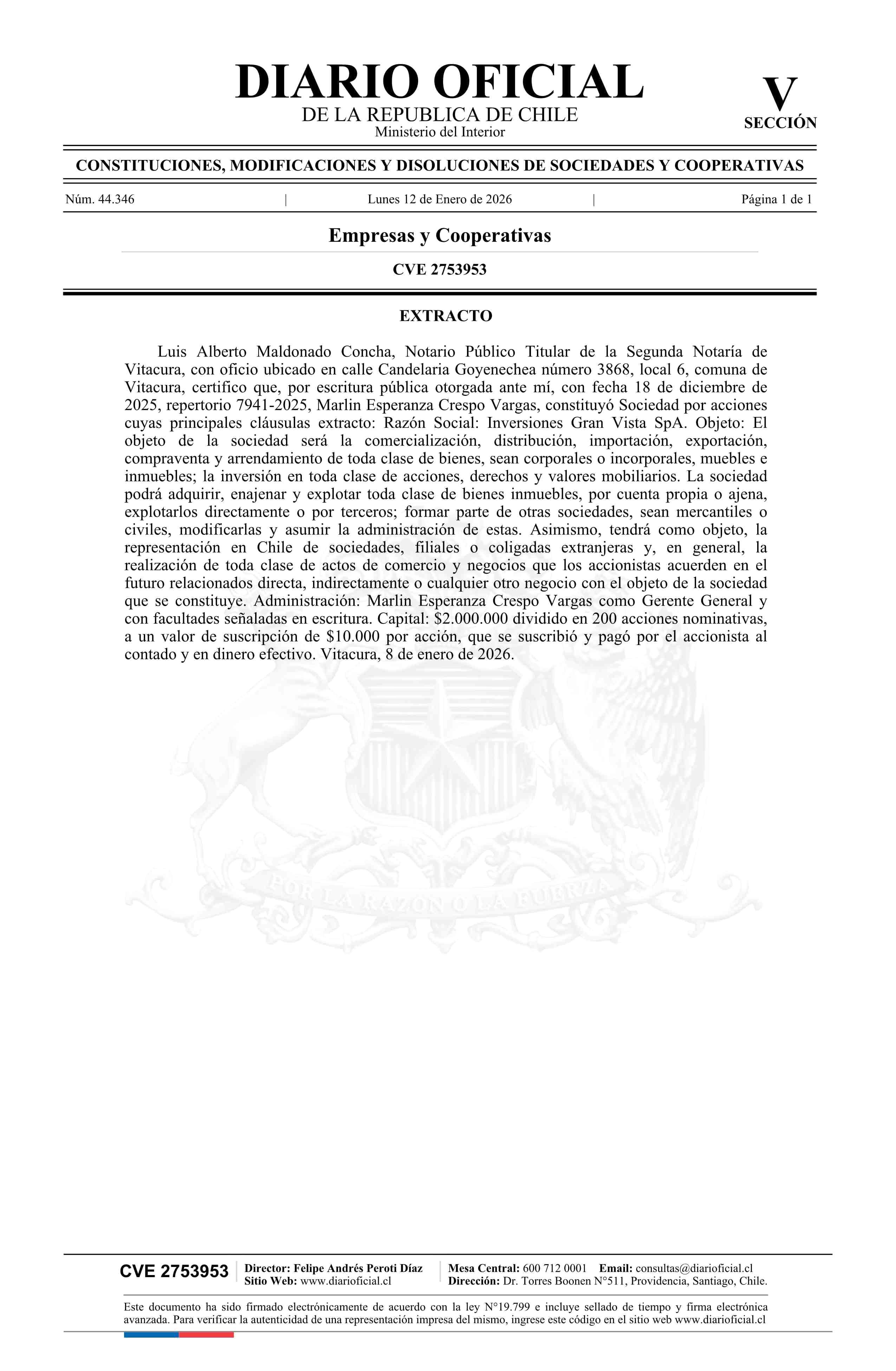 INVERSIONES GRAN VISTA SpA 12-01-2026 Diario Oficial Edición Electrónica |