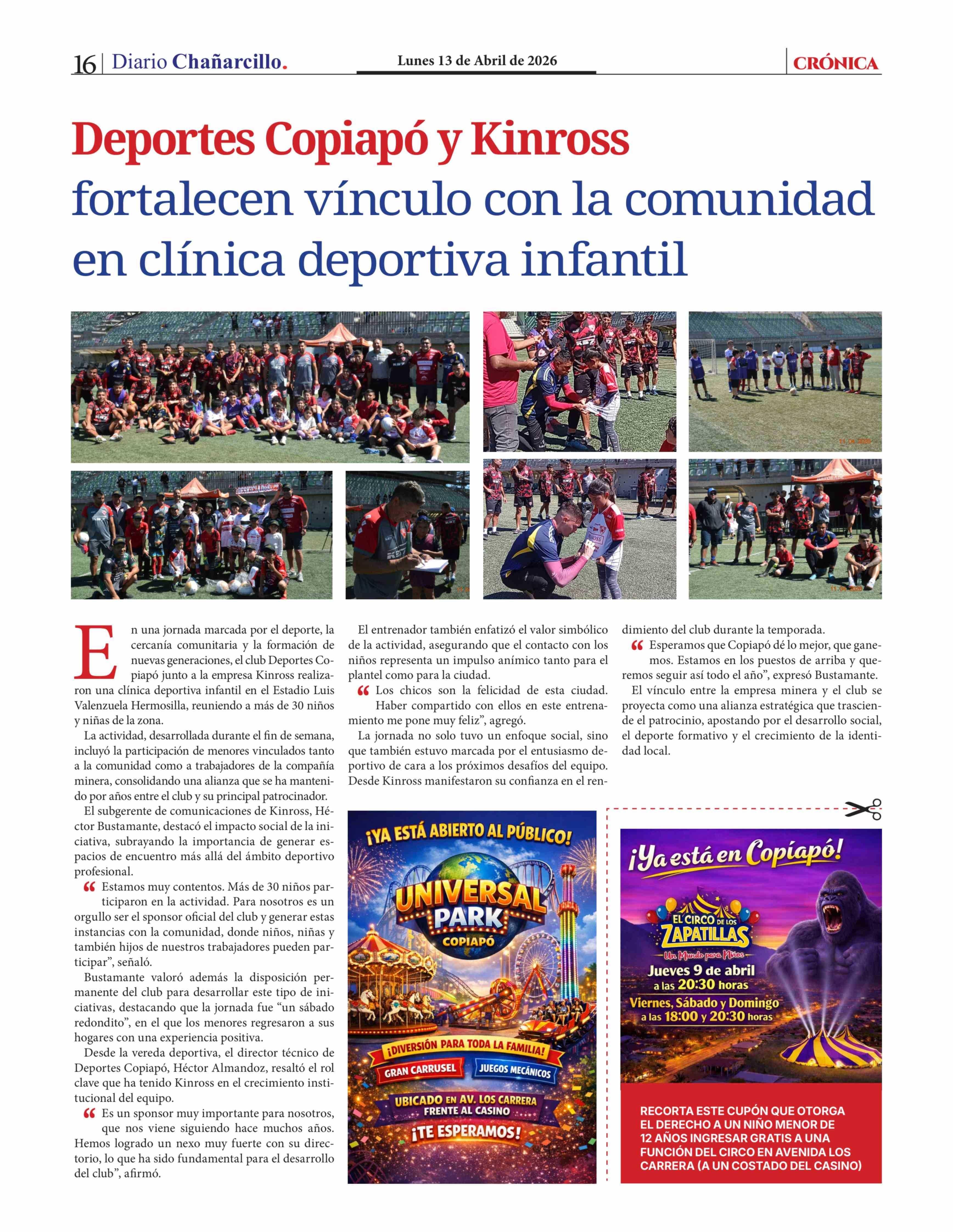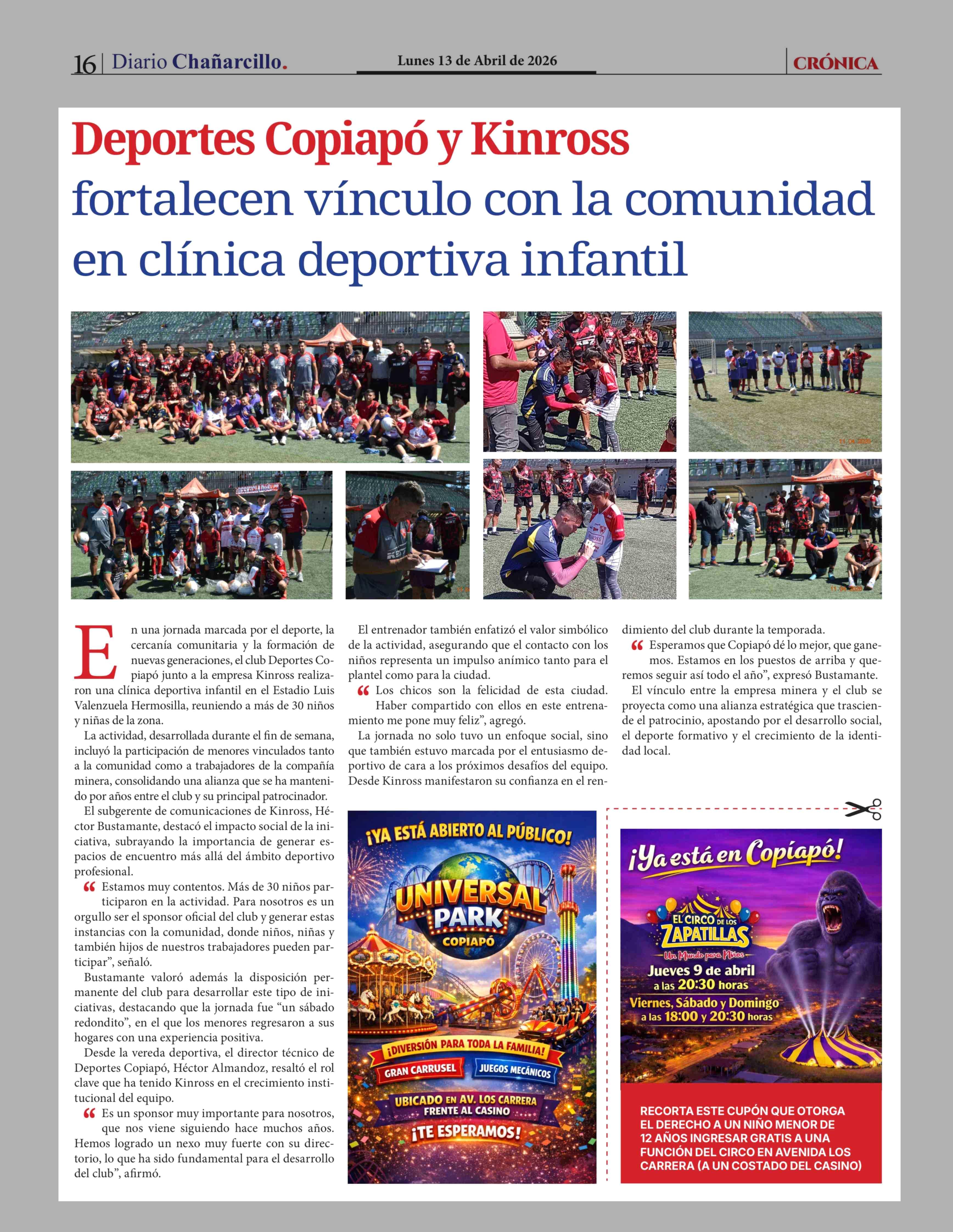 Deportes Copiapó y Kinross fortalecen vínculo con la comunidad en clínica deportiva infantil 13-04-2026 Diario Chañarcillo |