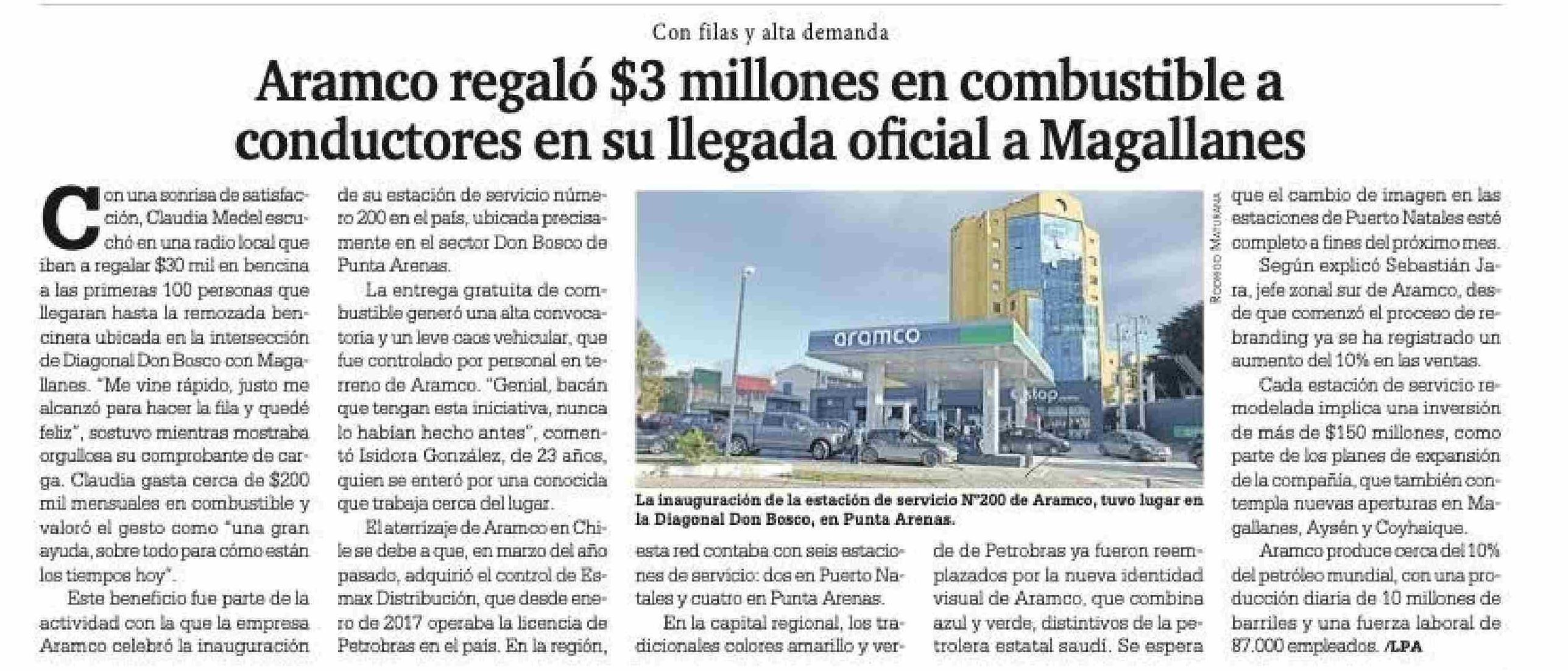 | Título: | Aramco regaló $3 millones en combustible a conductores en su llegada oficial a Magallanes |