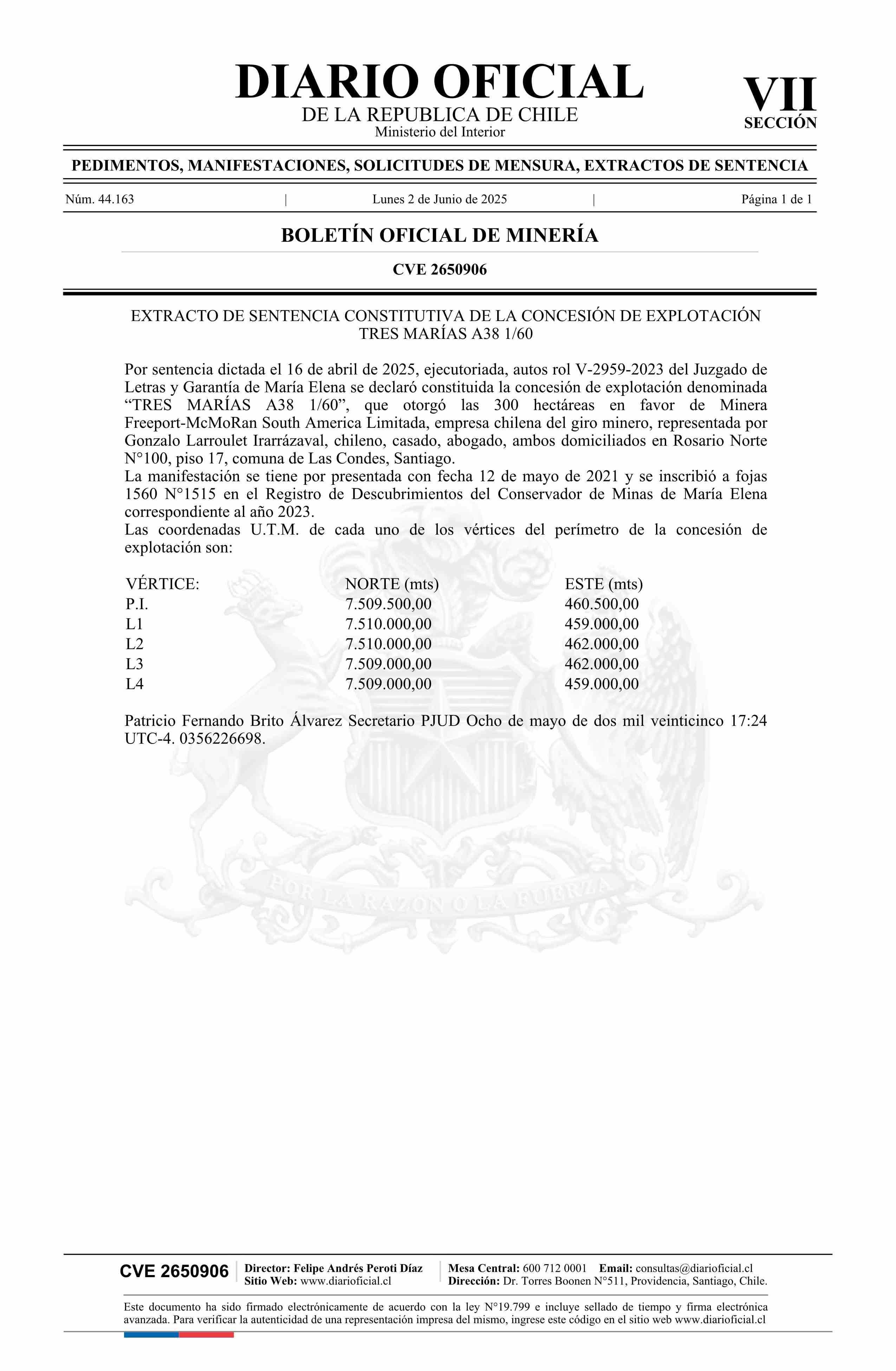 TRES MARÍAS A38 1/60 / Minera Freeport-McMoran South America Limitada 02-06-2025 DIARIO OFICIAL CHILE - BOLETÍN OFICIAL DE MINERÍA |