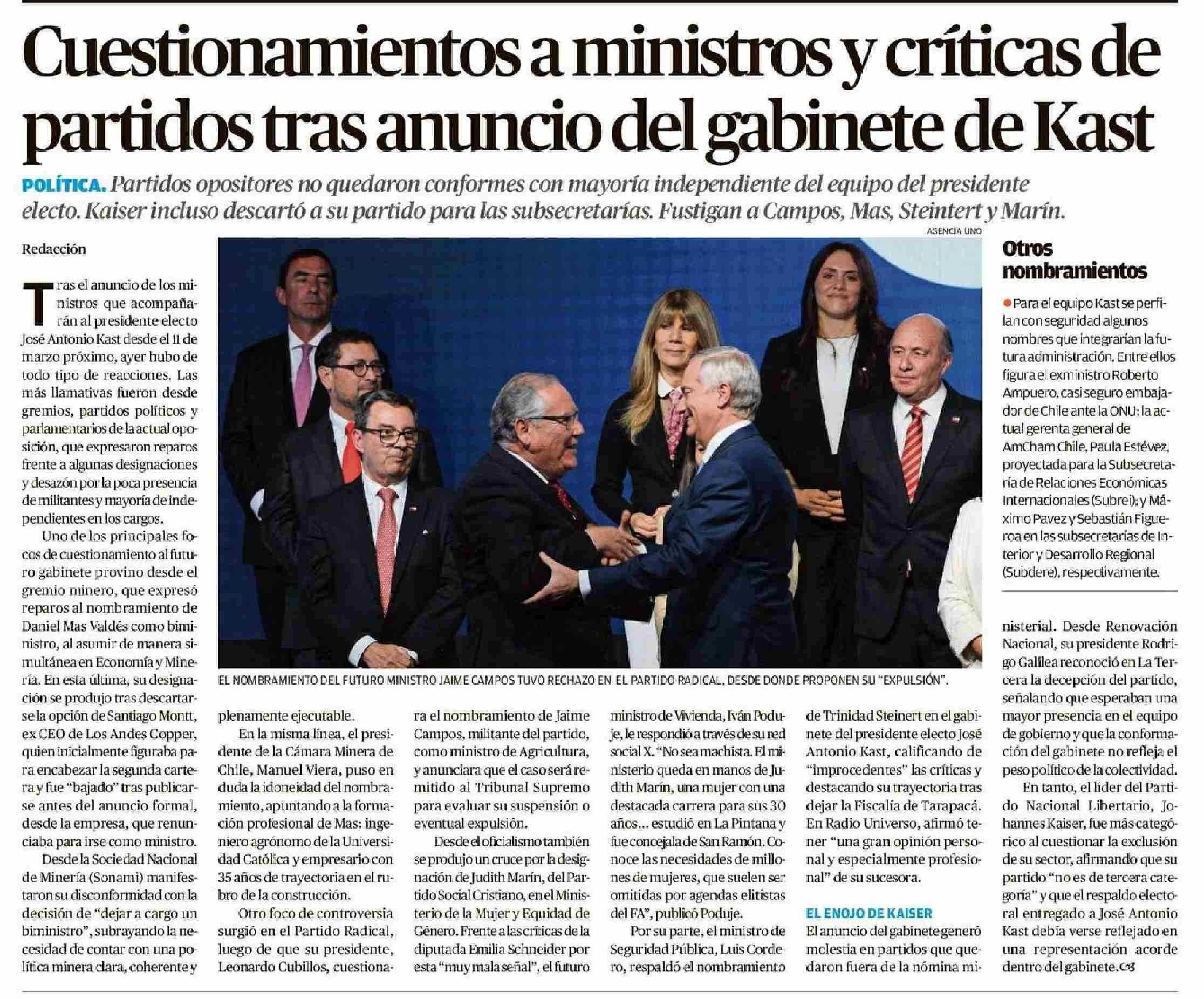 Título: Cuestionamientos a ministros y críticas de partidos tras anuncio del gabinete de Kast