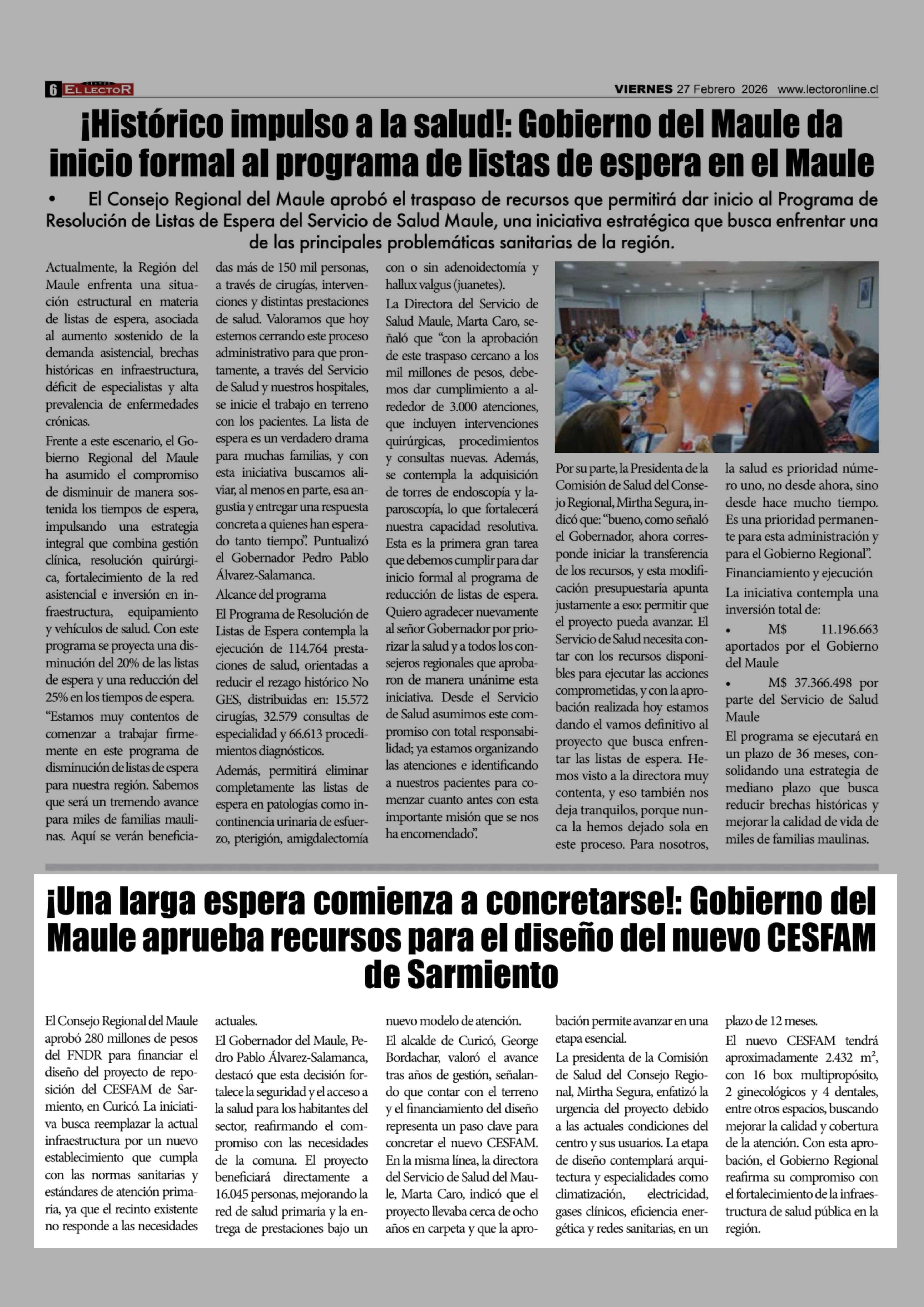 ¡Una larga espera comienza a concretarse !: Gobierno del Maule aprueba recursos para el diseño del nuevo CESFAM de Sarmiento 27-02-2026 El Lector |